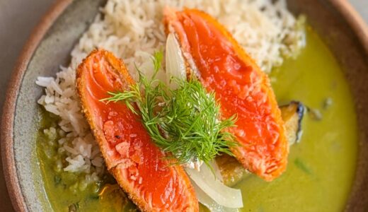 まずはお目当ての看板メニュー。グリーンとオレンジのコントラストが鮮やかな一皿は、運ばれてきた瞬間からテンション高まるビジュアル!衣はサクッと軽く、厚切りサーモンは絶妙な火入れでとろけるようなレア加減。カルダモン・クミン・コリアンダーなど数種類のホールスパイスとハーブを挽いてカピ(海老のペースト)を合わせた自家製ペーストのグリーンカレーは、さらりとしたテクスチャーでフレッシュな香りとほどよい辛さがサーモンの脂と相性が良く、サワークリームとディルのソースが全体をまろやかにまとめ、完成度の高さに思わず唸っちゃいます。