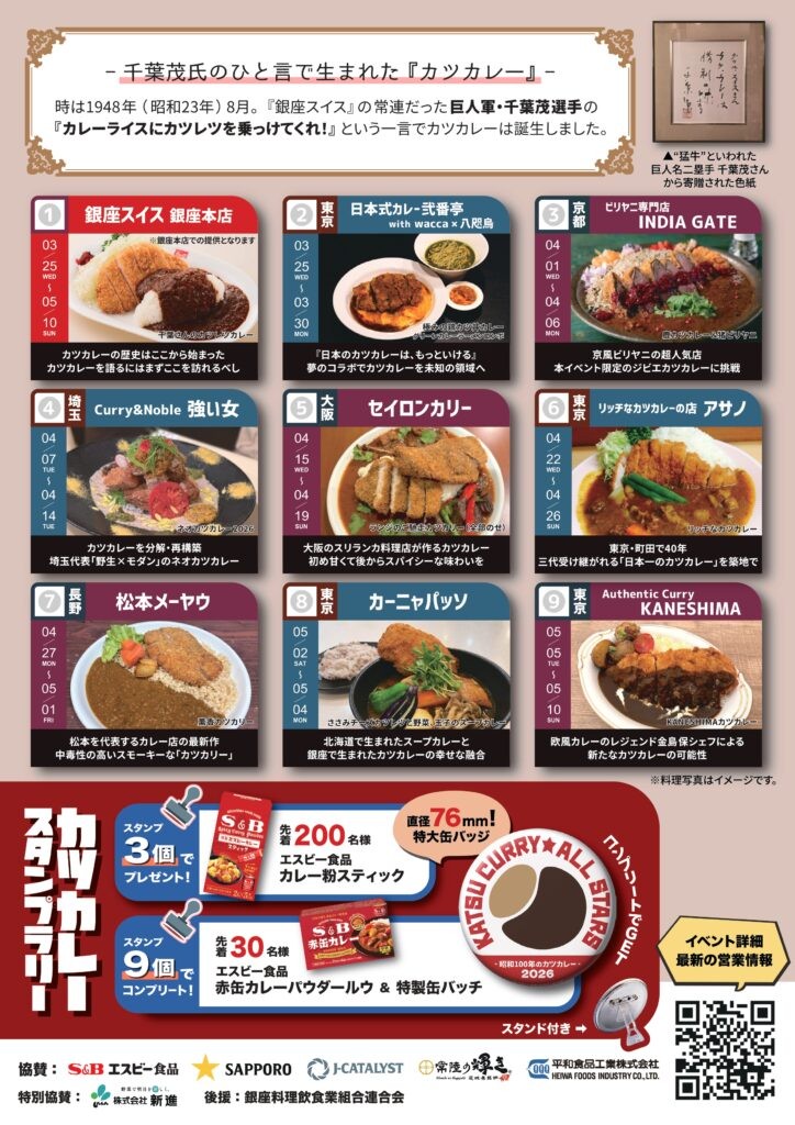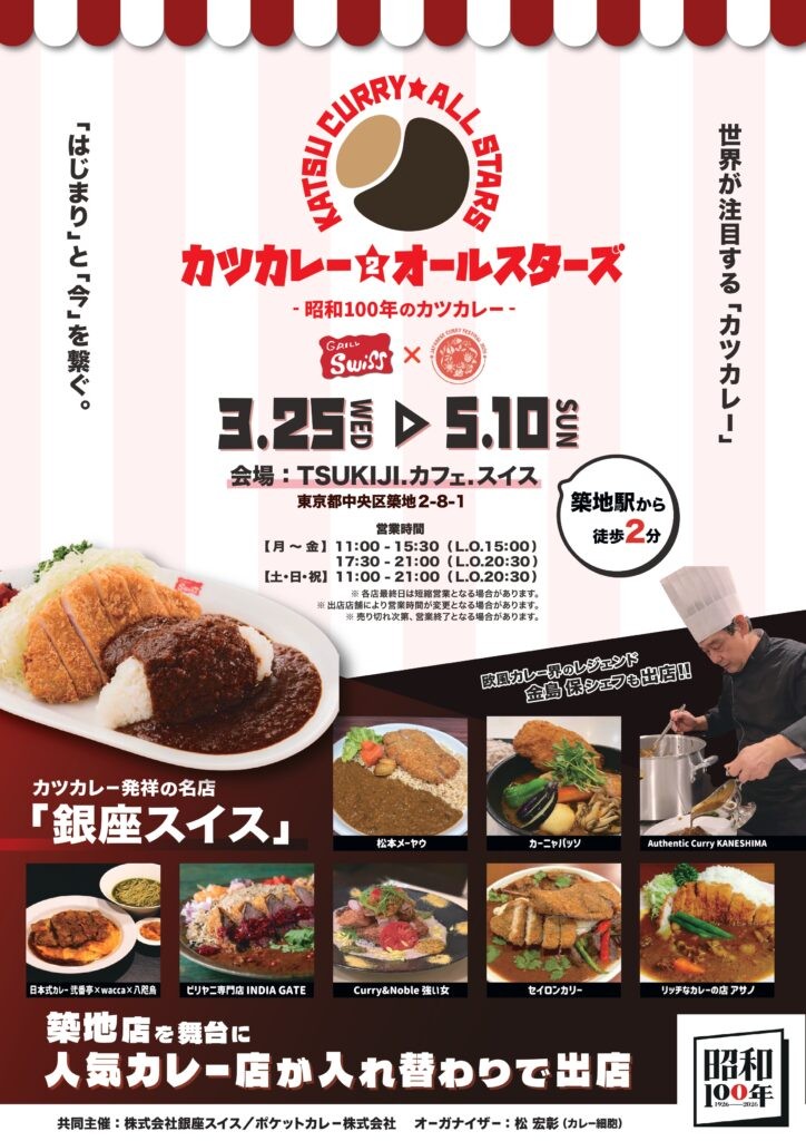 昭和100年という節目を迎える2026年、カツカレー発祥の店「銀座スイス」の築地店を舞台に、全国から選りすぐりの名店がリレー形式で出店する「カツカレー★オールスターズ2」が開催されます!