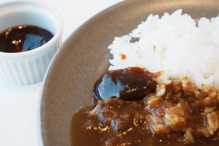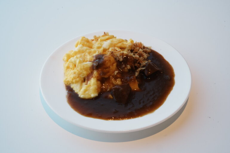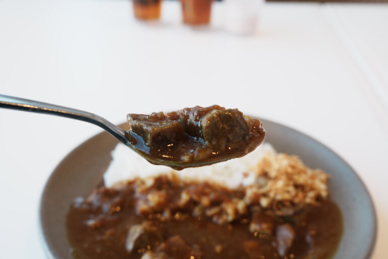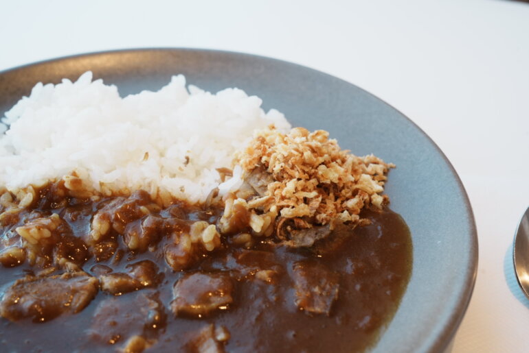 いかにもホテルの欧風カレーらしいグレービーソースは艷やかで良い色をしている。玉ねぎをソテーしたものと、フライしたものを取り入れた”ダブルオニオン”がこの旨味のベースになっていて、絶妙に焦がされた苦味と甘みがうまい。そのあとに感じる酸味はどうやらリンゴを煮詰めた”アップルプレザーブ”が使われていて爽やかな旨味も演出している。カレーのサーブ時にシェフに聞いてみたところハイカレーに使われている牛肉は日によって違うらしく、ディナーで出しているローストビーフを調理した際の切り落とし部分なども使っているそう。