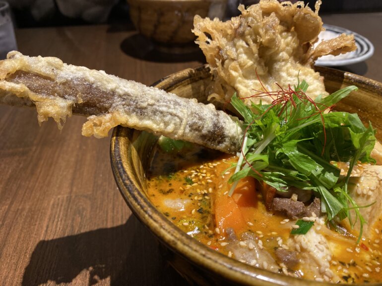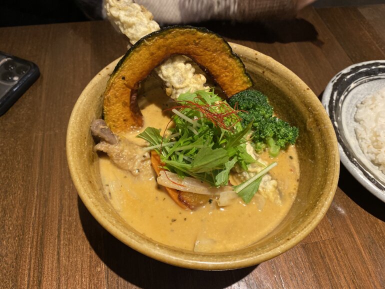 ゴボウ天でかい〜〜まいたけ天もおおきい〜〜これだけでテンションがあがっちゃいます。そして11月の札幌はなかなかの寒さだったので、このスープカレーが暖かくてとても救われました。