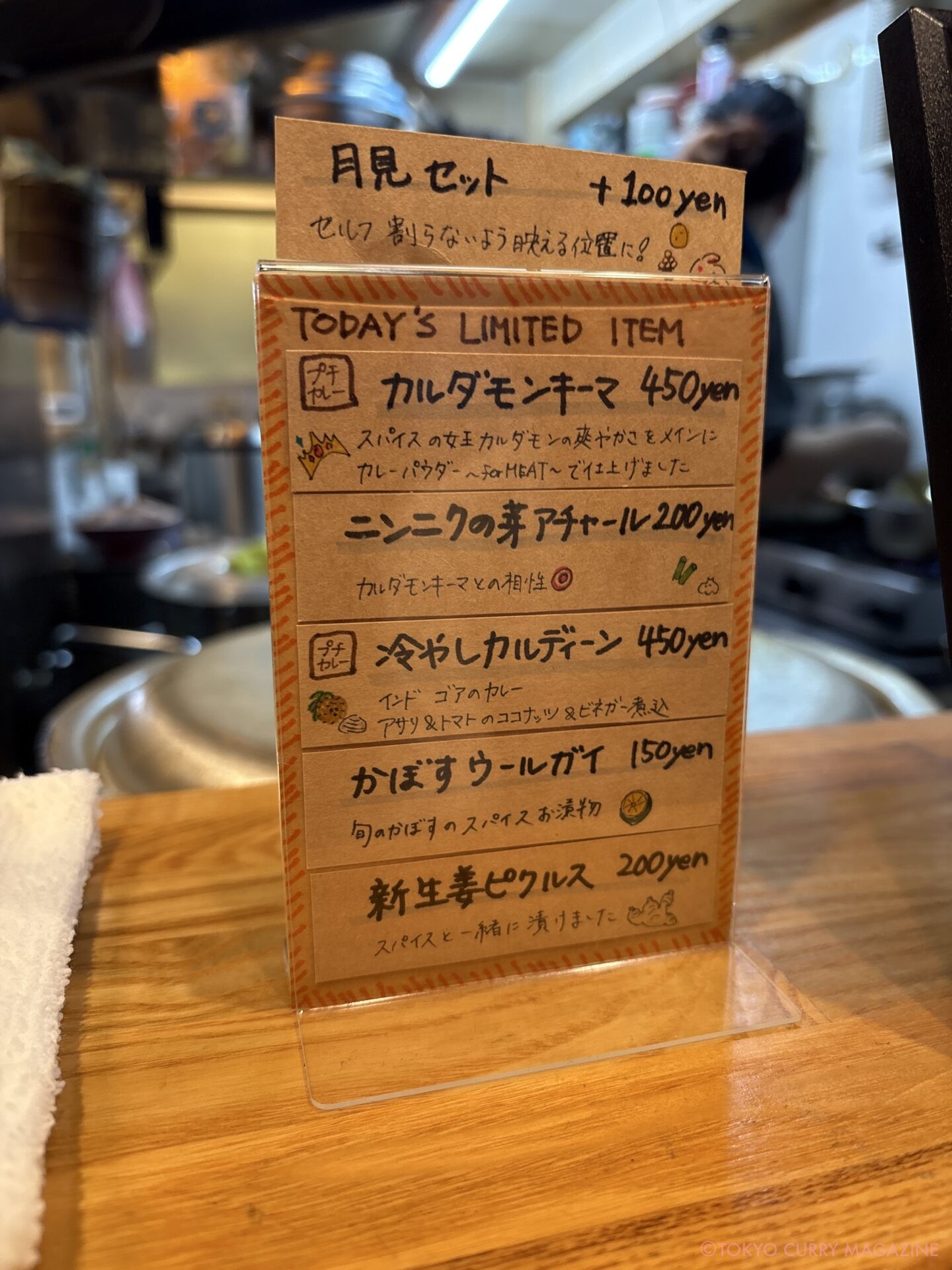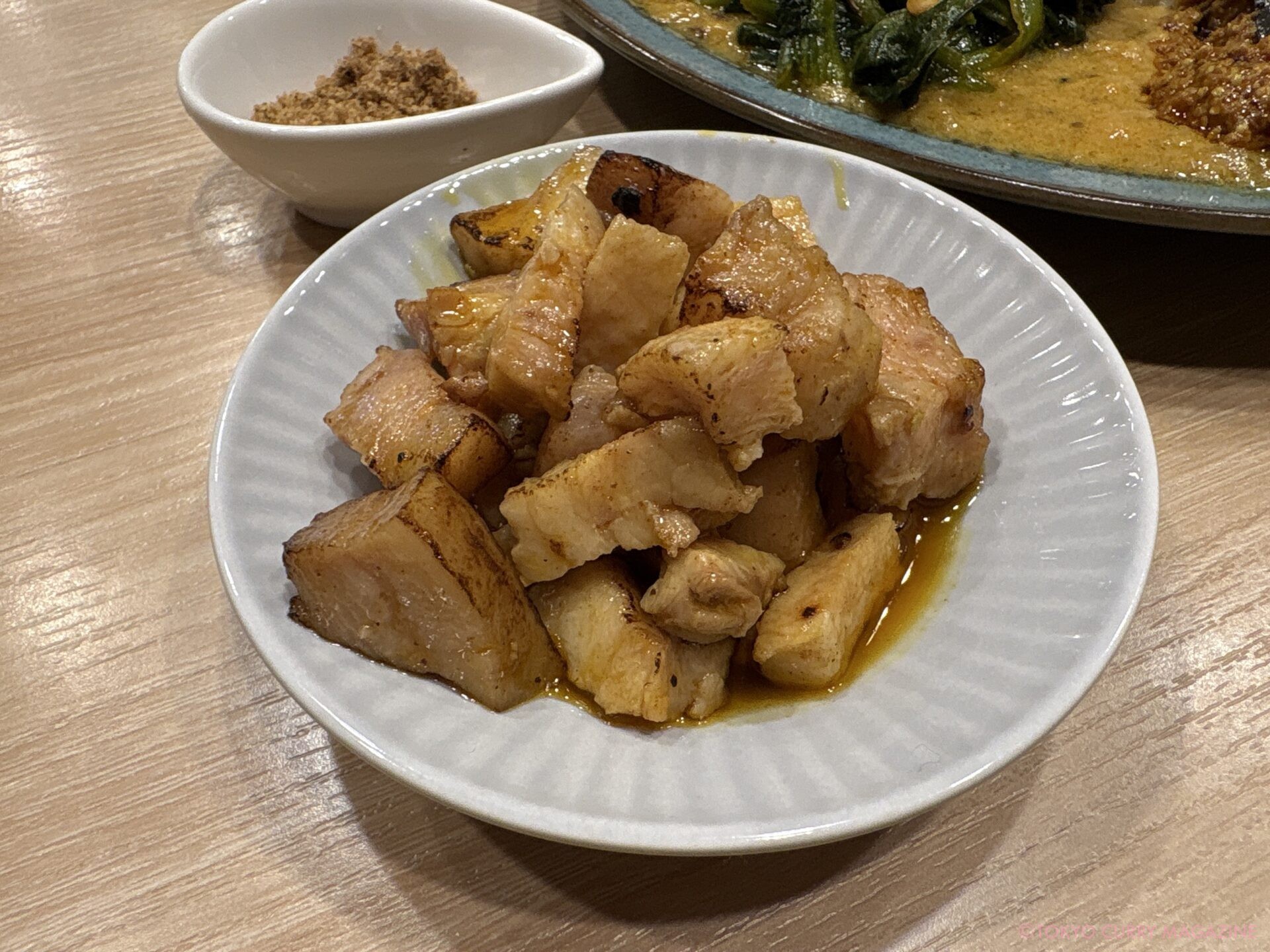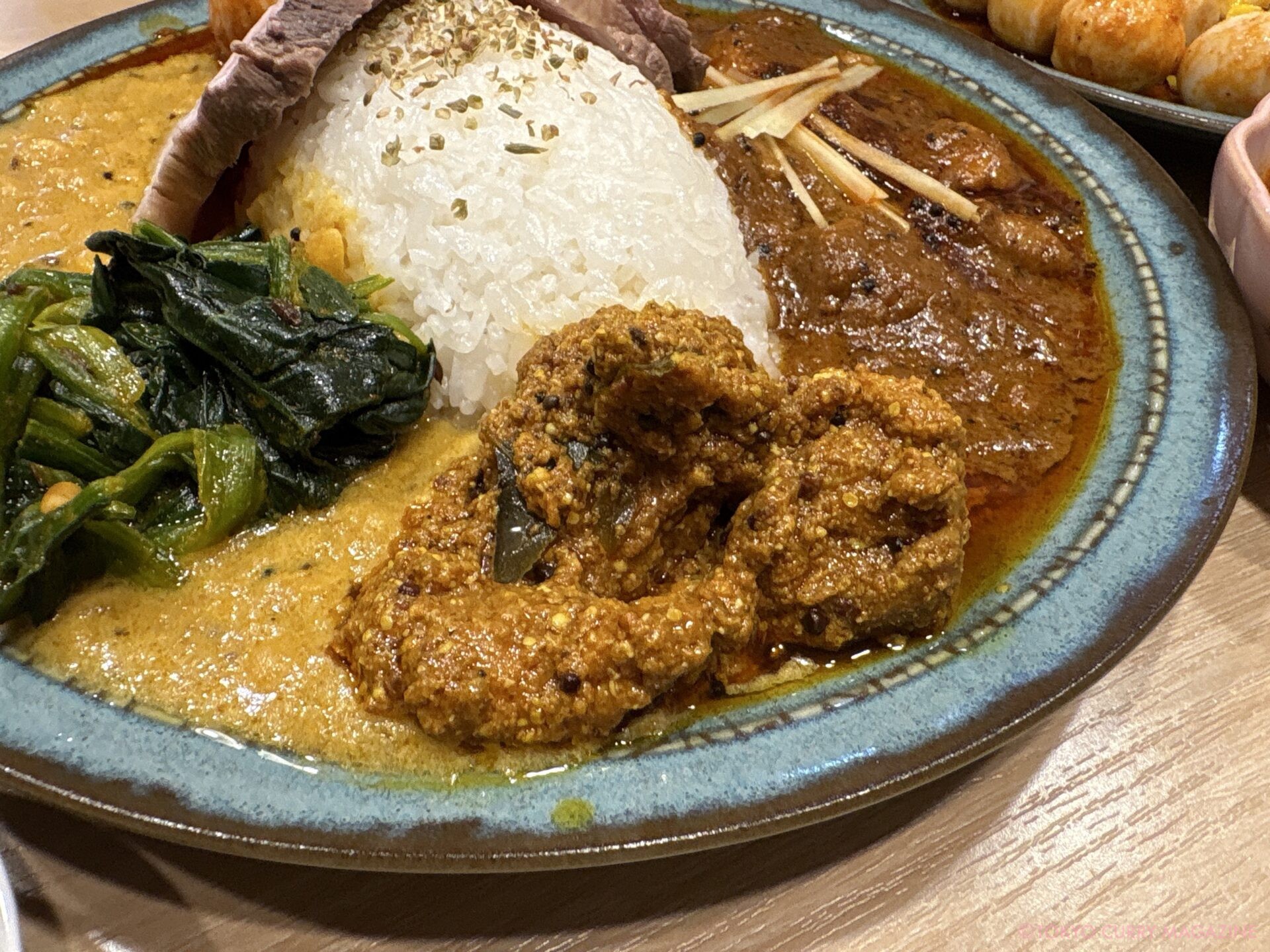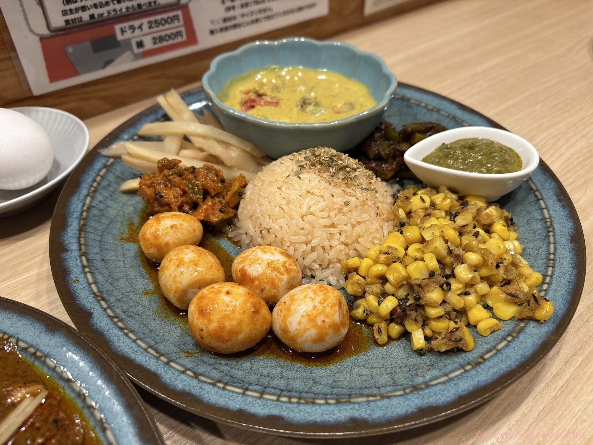 この日は、特製クロロプレートに+マサラ煮豚+カルダモンキーマ+ニンニクの芽アチャール+冷やしカルディーン+コーンポリヤル+うずらアチャール+かぼすウールガイ+新生姜ピクルス+月見セットこれに炙りマサラ脂身を加えたワンパク仕様。(SNSフォロワー限定特典もあります!)