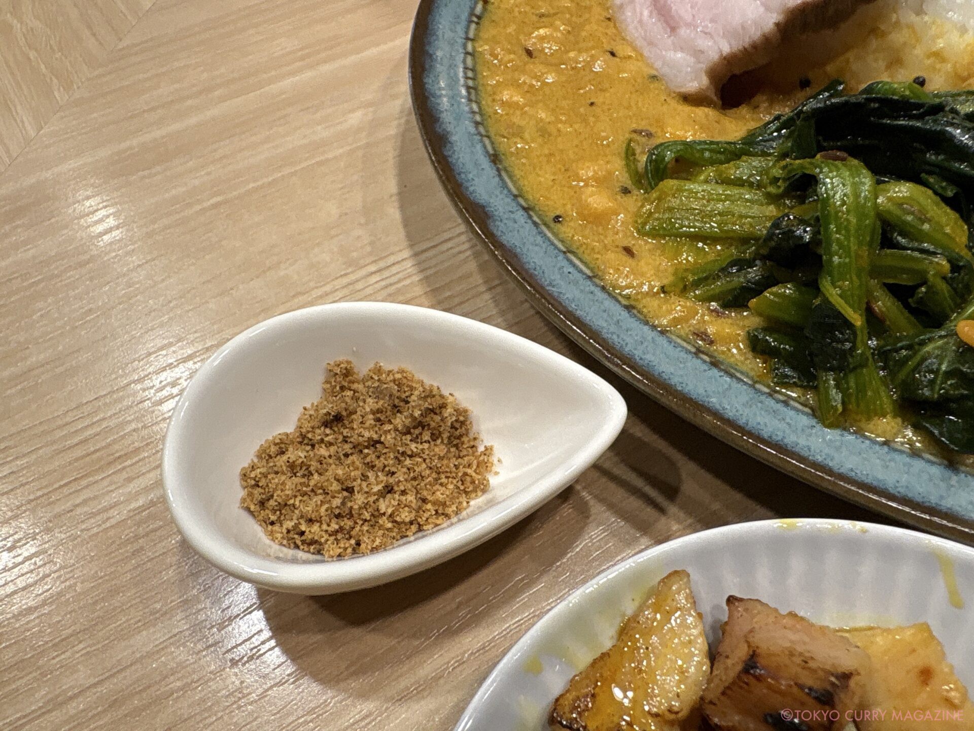 ダルはパリップのような旨味が詰まった味わいでトッピングのサーグと相性抜群。2種のカレーだけでも十分楽しめる内容となっていますが、トッピングを加える事で、カレーの奥行がどんどん広がるからまた不思議。今回のトッピングでいうと煮豚やうずら卵、針生姜、脂身…なんだかラーメン店を彷彿させる物も散見されますが、これもまたクロロの強みの1つ!