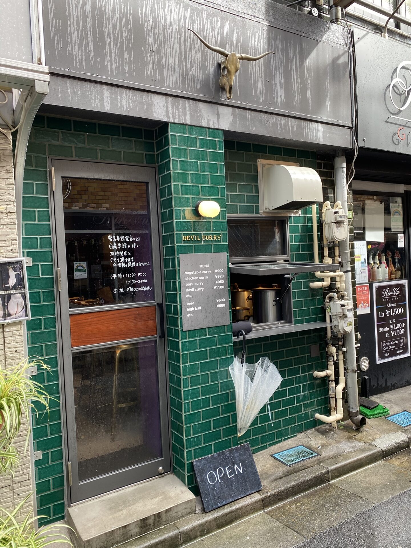 駅からとことこと歩いていくと見えてくるのが、緑のタイル張りのモダンな外観のデビルカレーです。カウンター5席ほどの店内は、席間も十分広く取られていて、男女問わず一人客が多い印象。