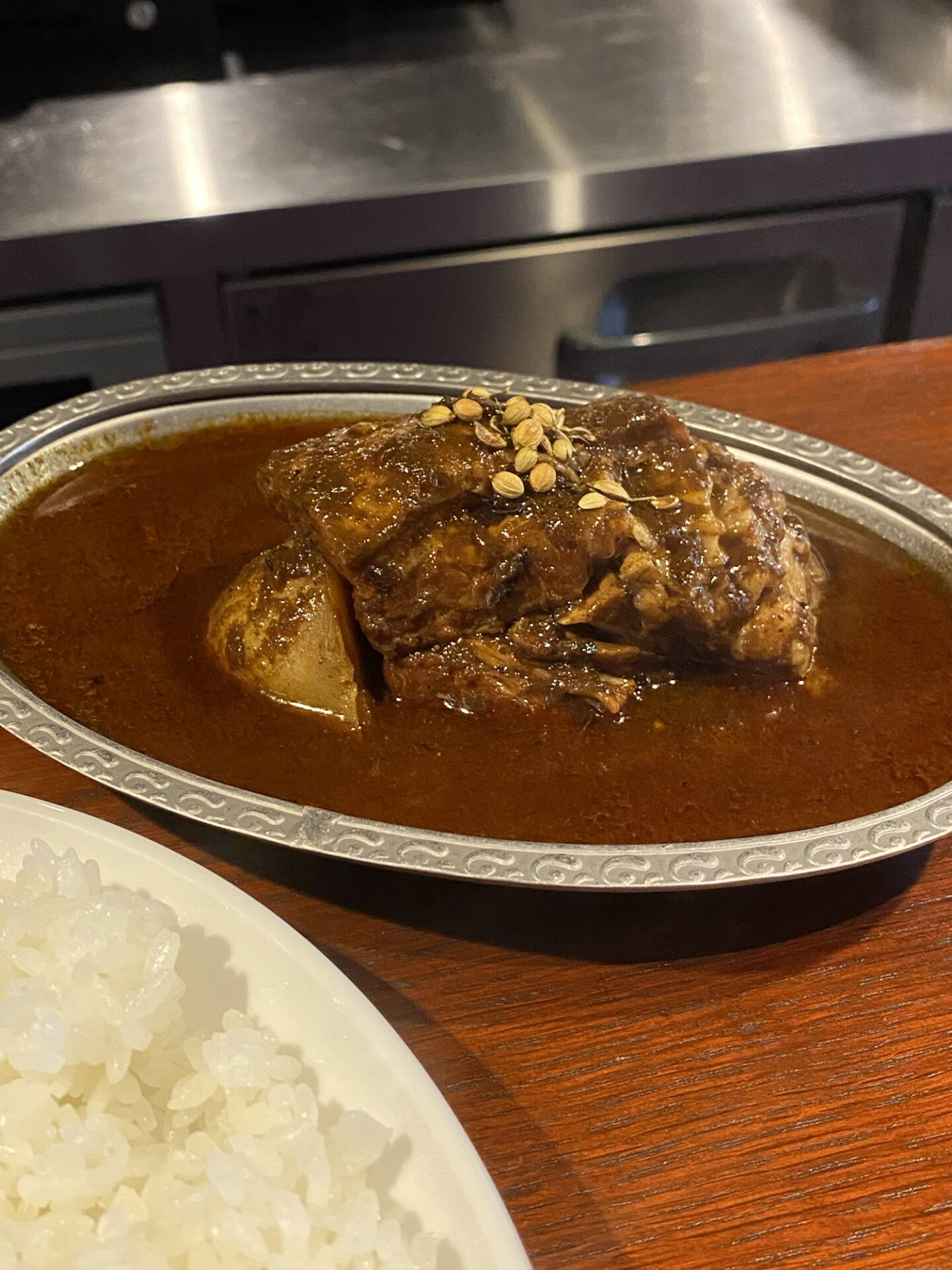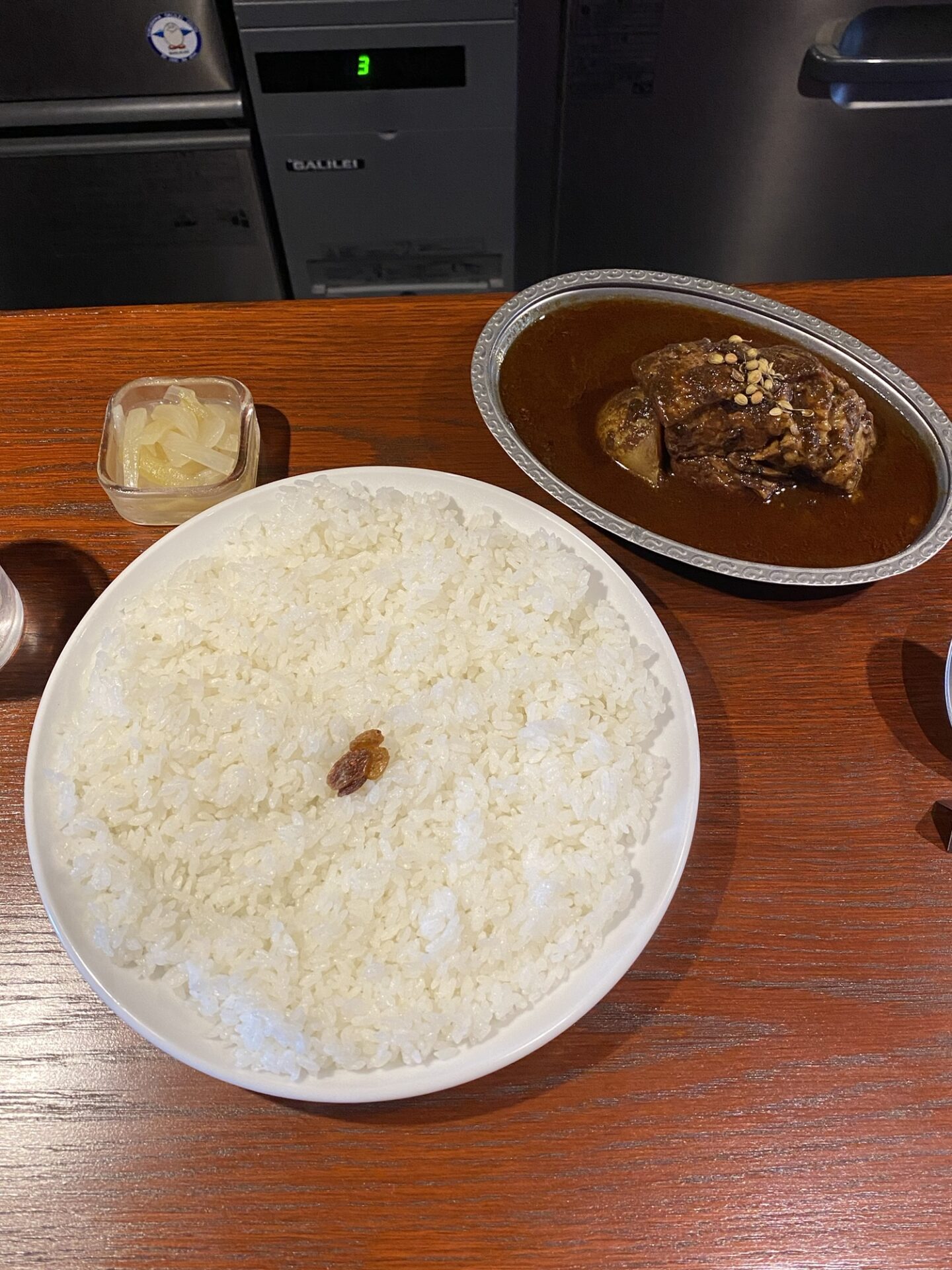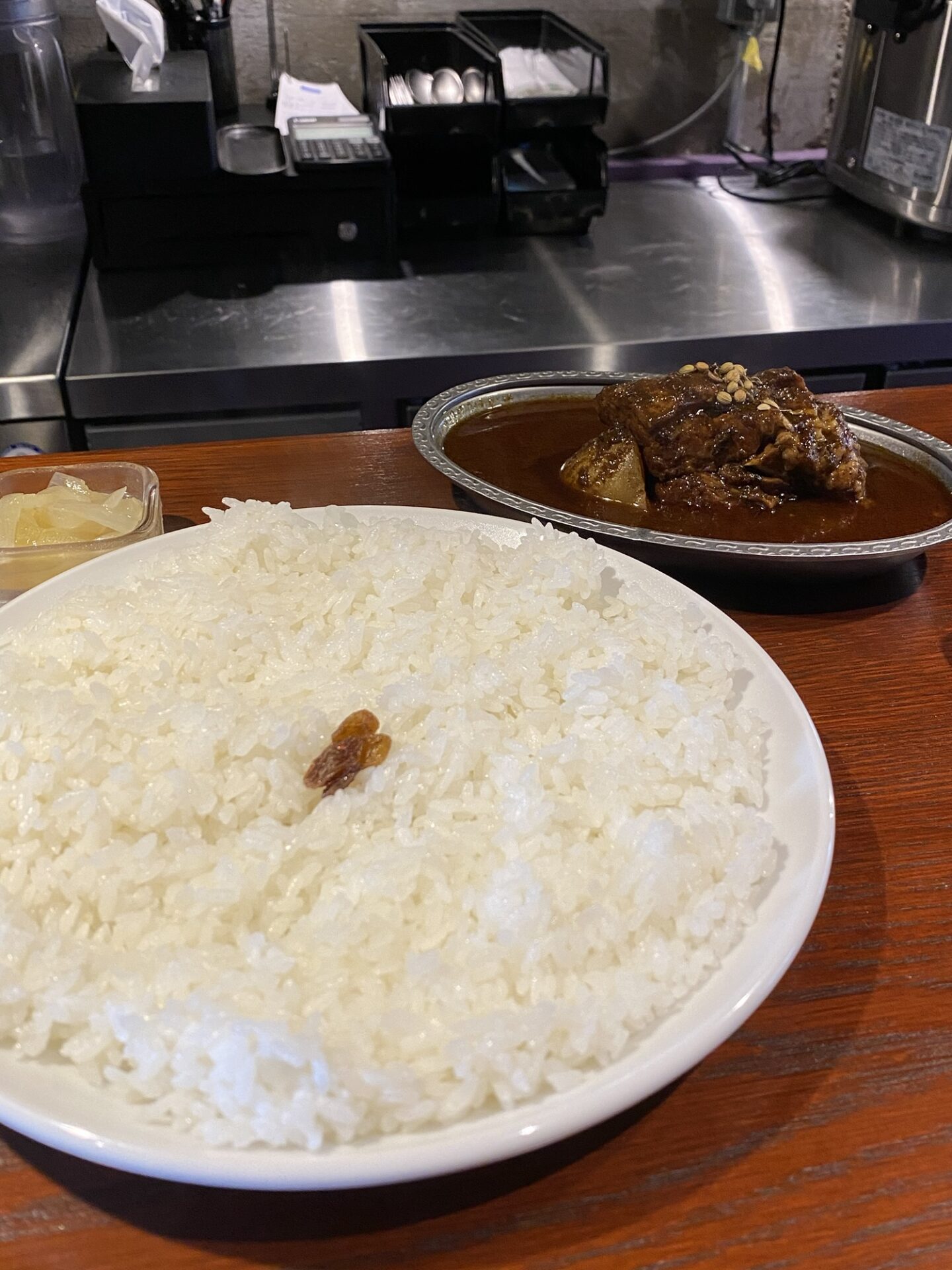 まず、カレーを一口食べてみる。皮膚に突き刺すような刺激的な辛さとともに、じわっと滋味深い旨味が拡がります。大きな豚の角煮は5cm角を超え、箸でスッと切れるほど柔らかいなかに、肉の弾力もあり、噛めば噛むほど、豚の脂の甘みや肉の旨みを感じます。ご飯に添えられた玉ねぎのピクルスをカレーと混ぜ合わせながら食べると甘みが加わり、ほのかにマイルドな口当たりとなり、違った味わいを楽しめます。