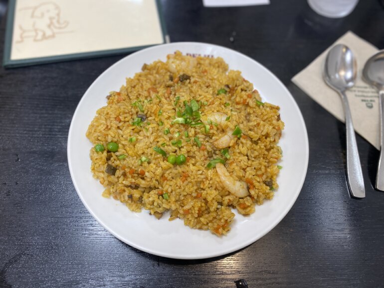 均等に炒められたドライカレーにはマッシュルームや、細かく刻まれたお肉も入っていて、香りも旨味も感じられるおいしいカレーです。カシミールカレーとかだと乾き目の硬めのお米ですが、ドライカレーはペーストと一緒に炒められているので、しっとりしたライスでこれまたおいしいんですよね。