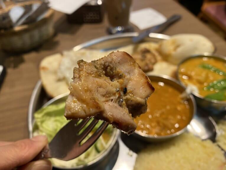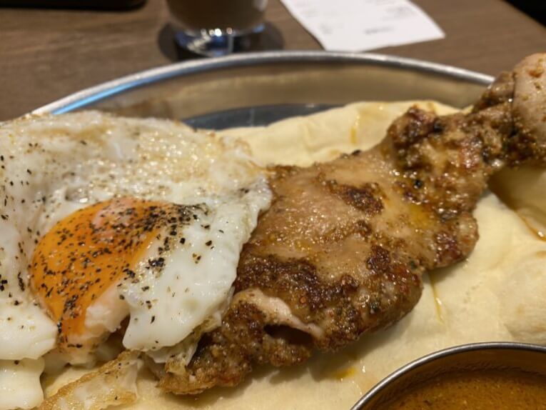 そしてケイジャンチキン!これが一番辛かった!スパイシーでおいしい・・・そしてめっちゃ柔らかくて、ナンでくるんでいただ来ました。目玉焼きが潰して、こちらもナンをつけて食べたりと、ひとつのプレートでとても楽しめました。