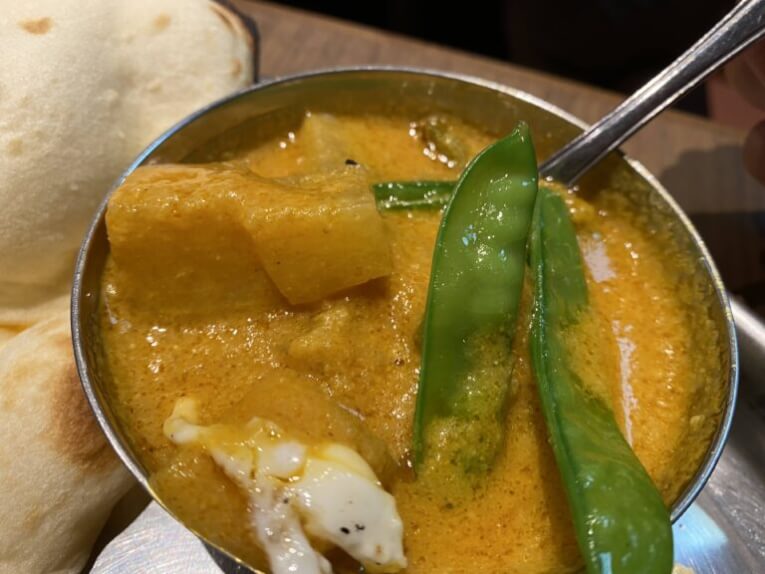 野菜カレーはほんのり甘くココナッツベースで、具材にはさやえんどうの他に大根などが入っていて、ついついバクバクとソースばかり食べてしまいたくなるスープのようなカレーでした!