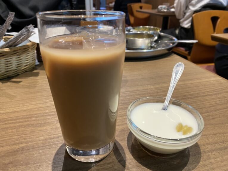 これだけ楽しめた食事の最後に、温かいチャイか、冷たいチャイが選べて、さらにおいしいヨーグルトまでついてきます。このヨーグルトがラッシーのようにおいしくて、そしてチャイは苦味のはっきりした本格的なチャイです。甘いのが好きな人は自分で砂糖入れるといいですよ!