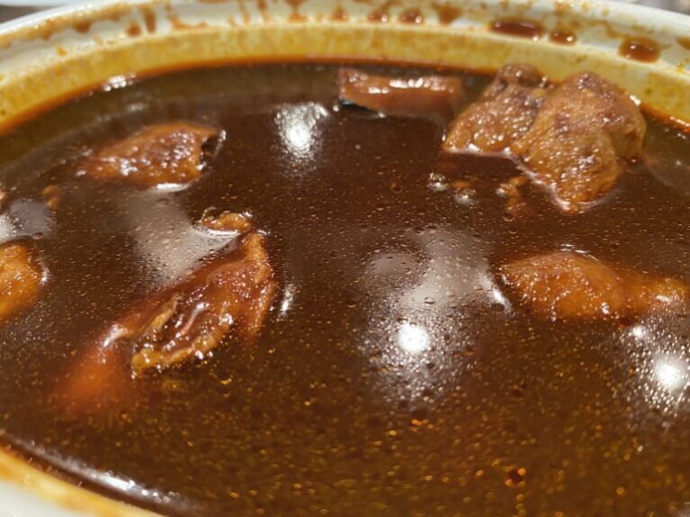 まずはカシミールのソースからいただきます。サラサラのスープを目視で確認し、さらにスプーンで確認しつつ、おいしそうな油とともにスープをすくって一口。