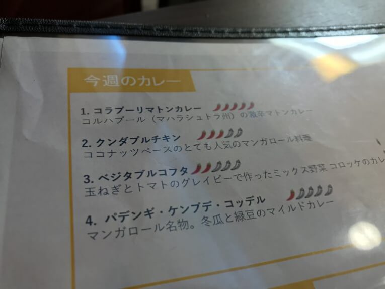 今回はあまり食欲がなかったので、辛さで刺激をしてもらおうと1番のコラプーリマトンカレーをセレクトしました。