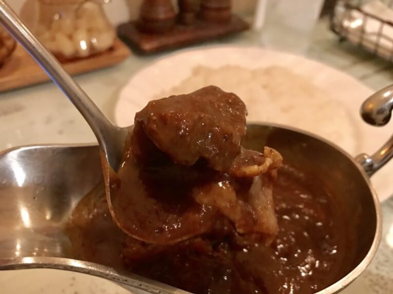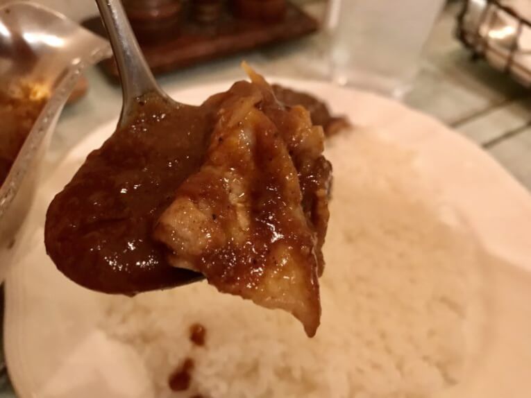 ポークカレーというと、厚切りを思い浮かべますが、キュイボンヌのポークカレーは豚バラと玉ねぎが使われています。これが食べやすくておいしいんです。カレーの玉ねぎってうまさしかない。