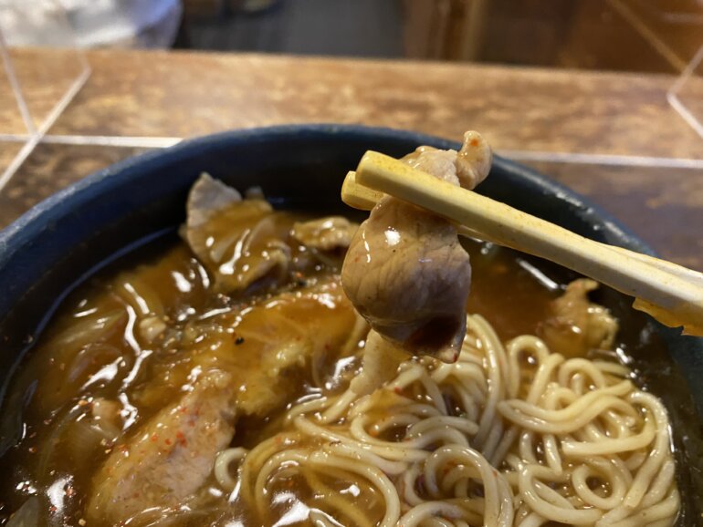 そしてそばの量にも圧倒されました。なかなか減らない(笑)途中で一度麺をリフトしてみたら、まだ1人前あるんじゃないか・・・というぐらいでした。そしてあつあつのカレールーは、ぜんぜん麺を冷ませない状態で、最後までおいしくいただけました。