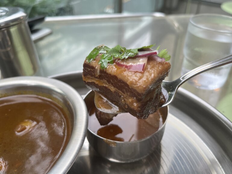 ポークビンダルーも新鮮でした!というのもとってもビネガーを感じます!舌でも感じますが、香りもビネガー!突き抜ける酸味のあるソースにパクチーの爽やかな香りがじめっとした気候を少し清々しくしてくれるようです。