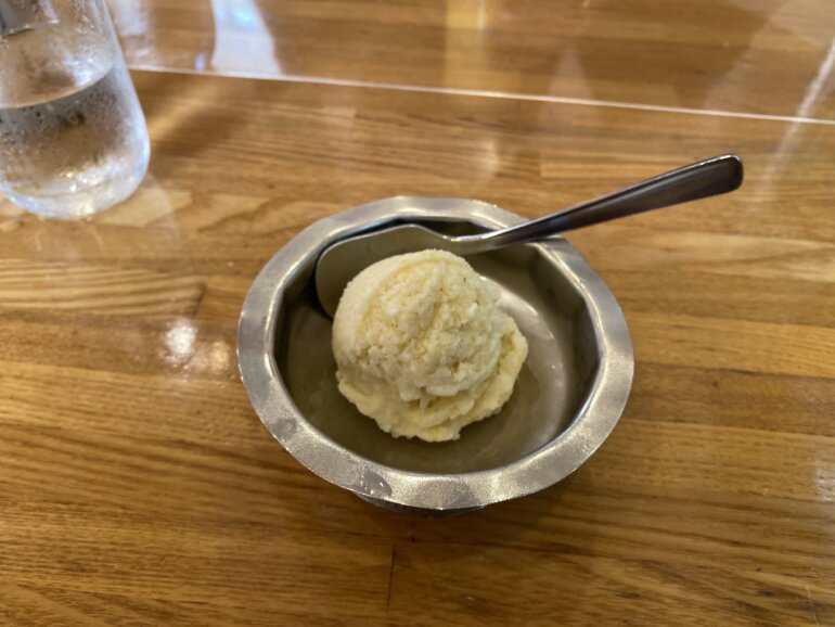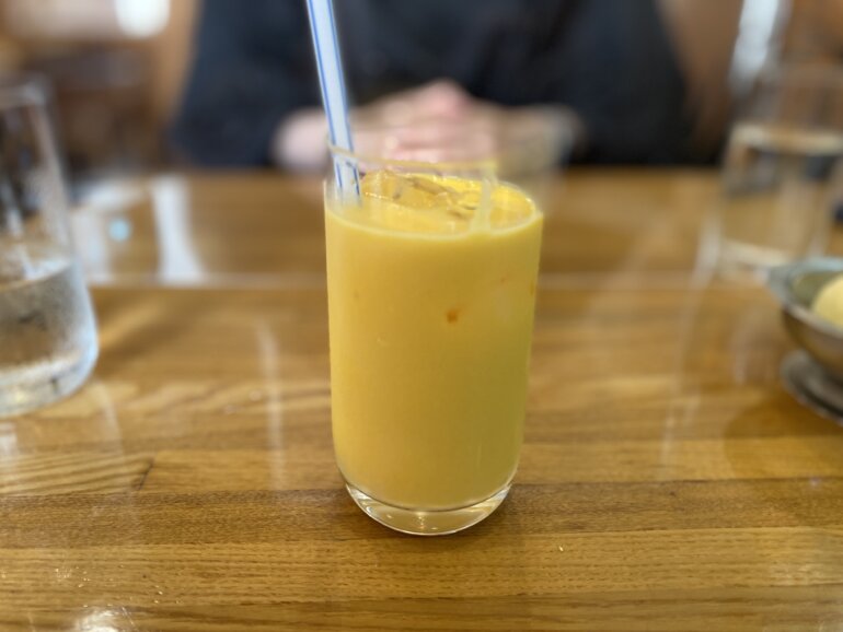 マンゴーラッシーは他のお客さんを見渡すとみんな頼んでいたので気になっていました。マンゴーラッシーは濃厚で吸うのも若干大変なくらい重めのラッシーでおいしい。でも多分食後だと重めなので、食前に飲んでおくのがおすすめかもです。アイスもアイスクリームというよりかはシャーベットのような感覚でりんごの繊維質と、細かく刻まれたさつまいもの質感が楽しめて、シャリシャリとした素朴においしいアイスでした。