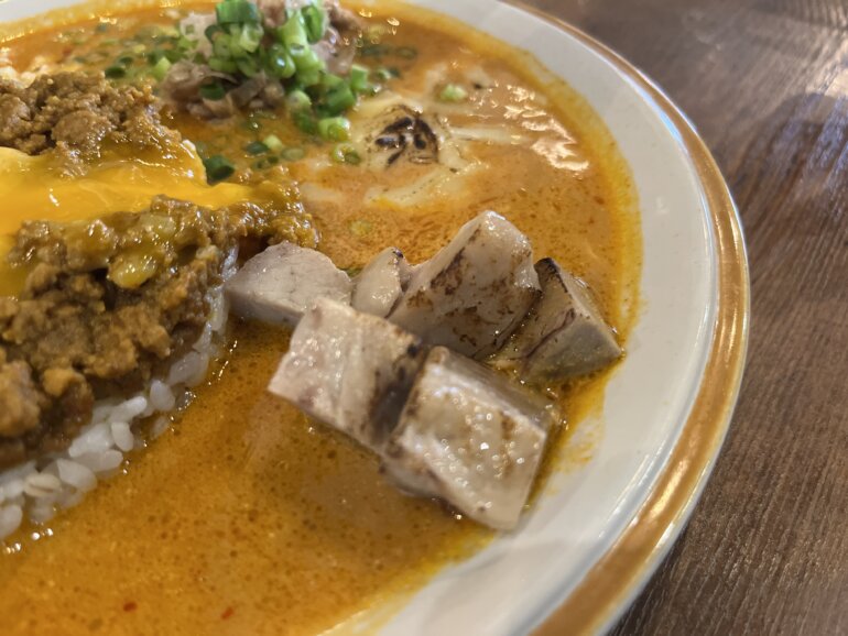 デフォルトで乗っかっているものは肉味噌キーマ、卵黄、豚積み、ぶしネギ納豆、焼きチーズ、日替わりアチャールです。豚積みが気になっていましたが、角切りにされた豚肉のようです。そしてぶしネギ納豆がとてもいい香りしております。