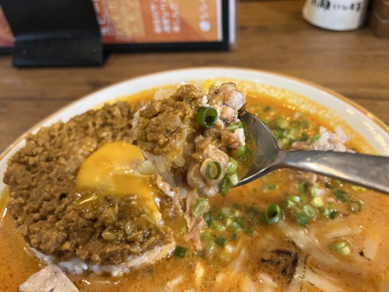 気になる味のほうですが、肉味噌キーマは思った通り、甘めなんですが塩もアクセントになるぐらいに効いていて、十分にこれだけでご飯が進みます。うまい!卵黄を途中から崩しながらキーマと絡めると濃厚さが倍になります。