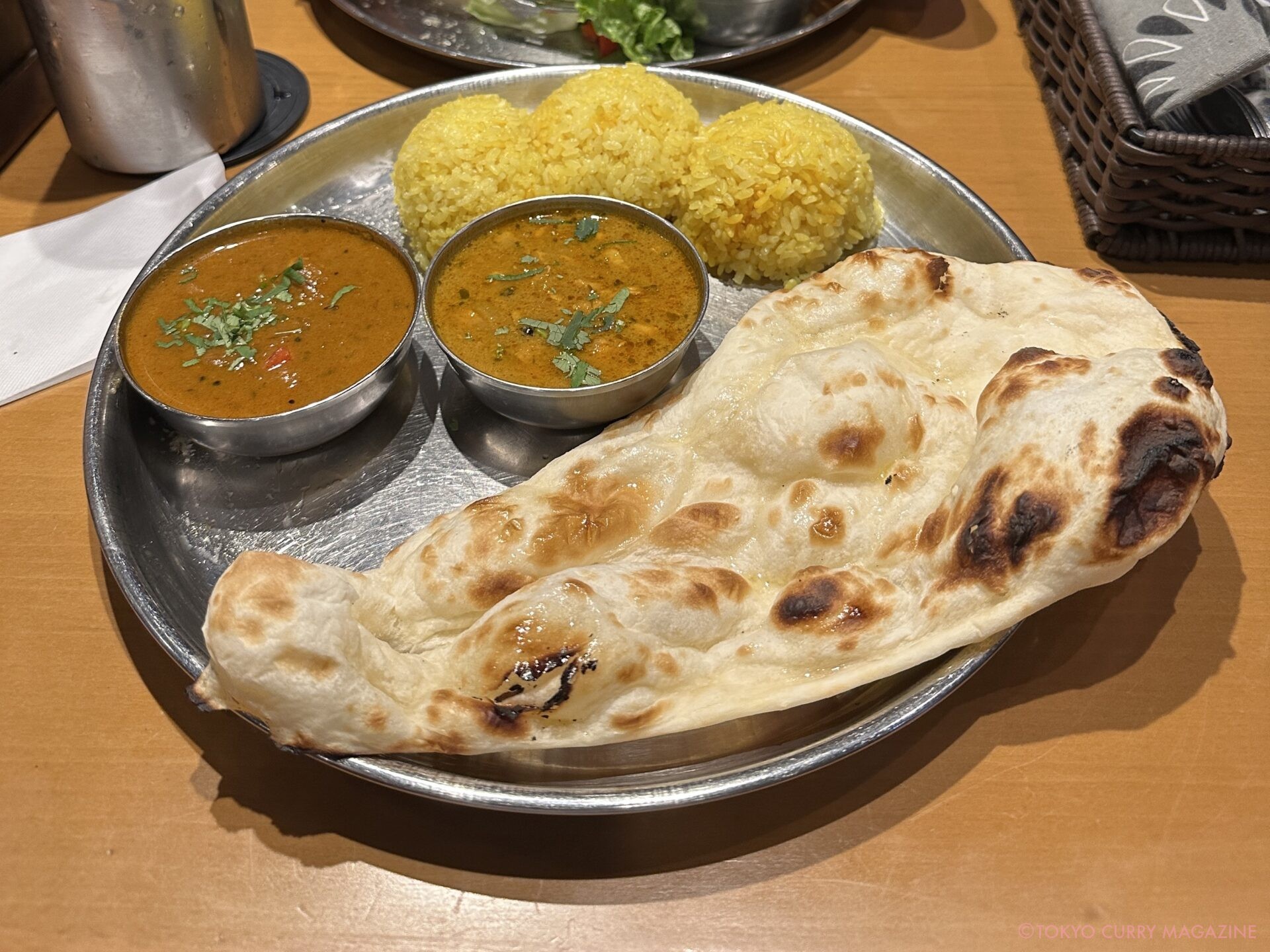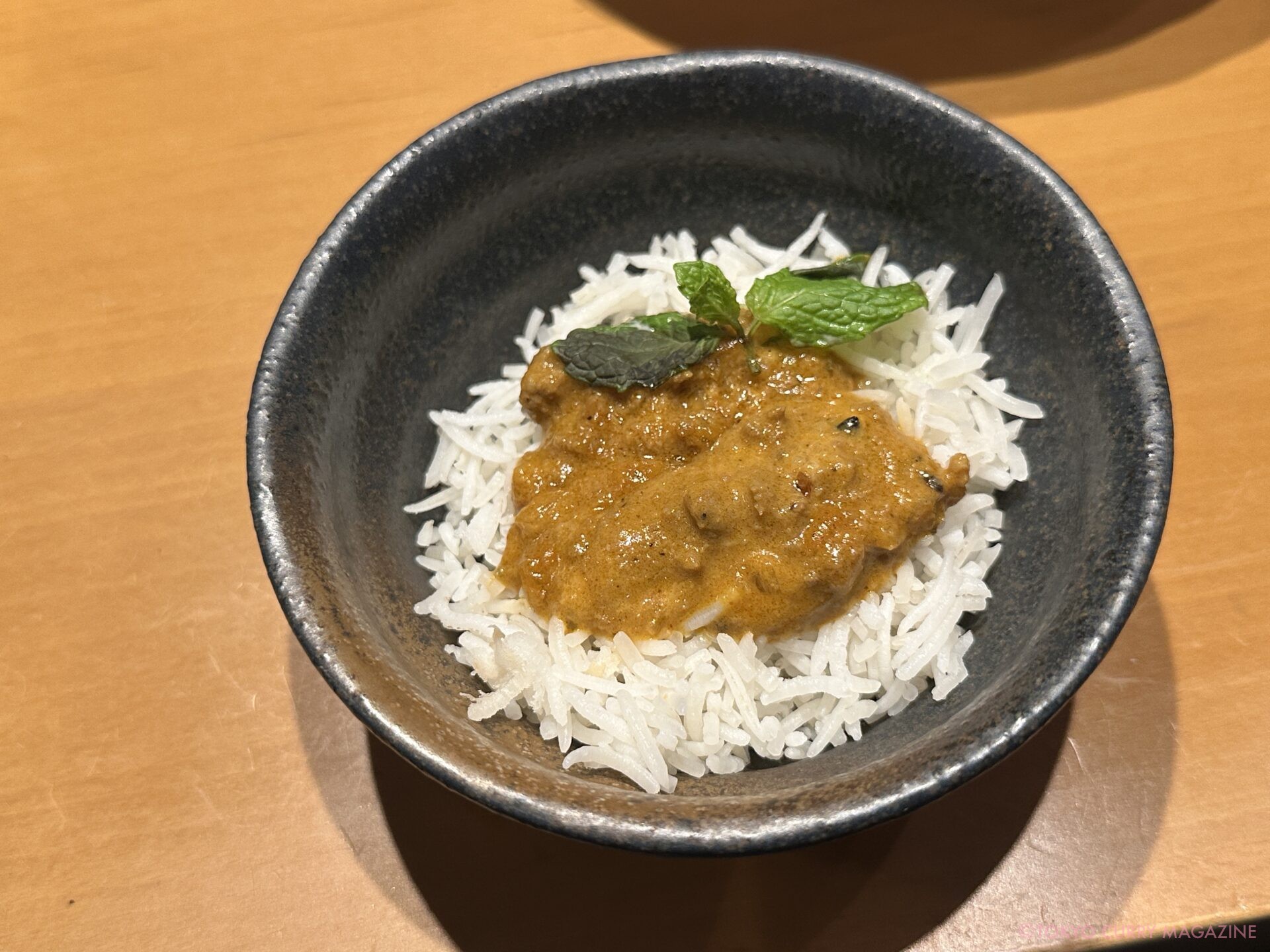 焼き立ては端が少しパリッとしていて、時間が経つとしっとり寄りに変化。一皿の中で食感が変わるのも面白かったです。バスマティライスと合わせて食べると、香りがさらに引き立ちます。