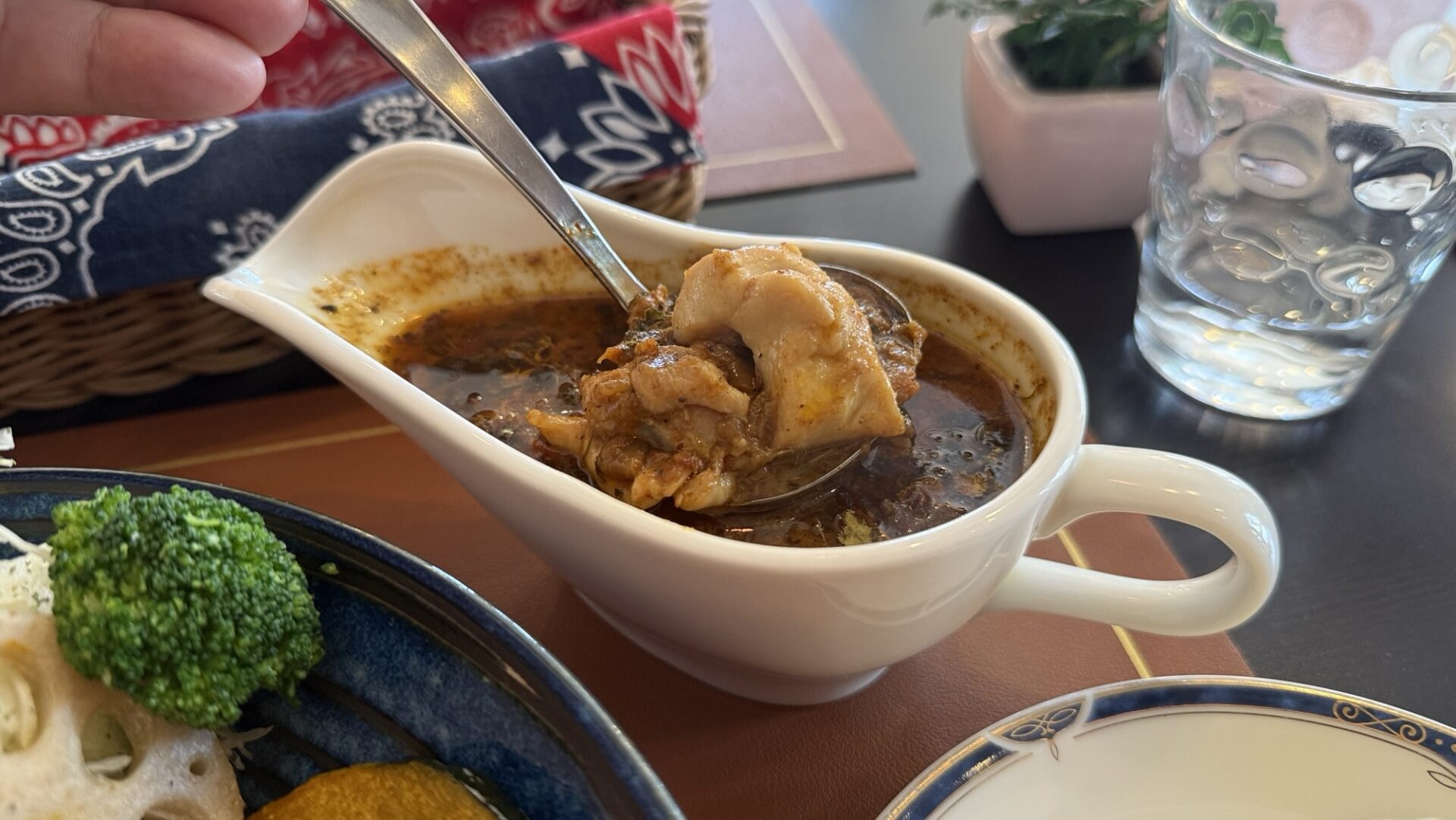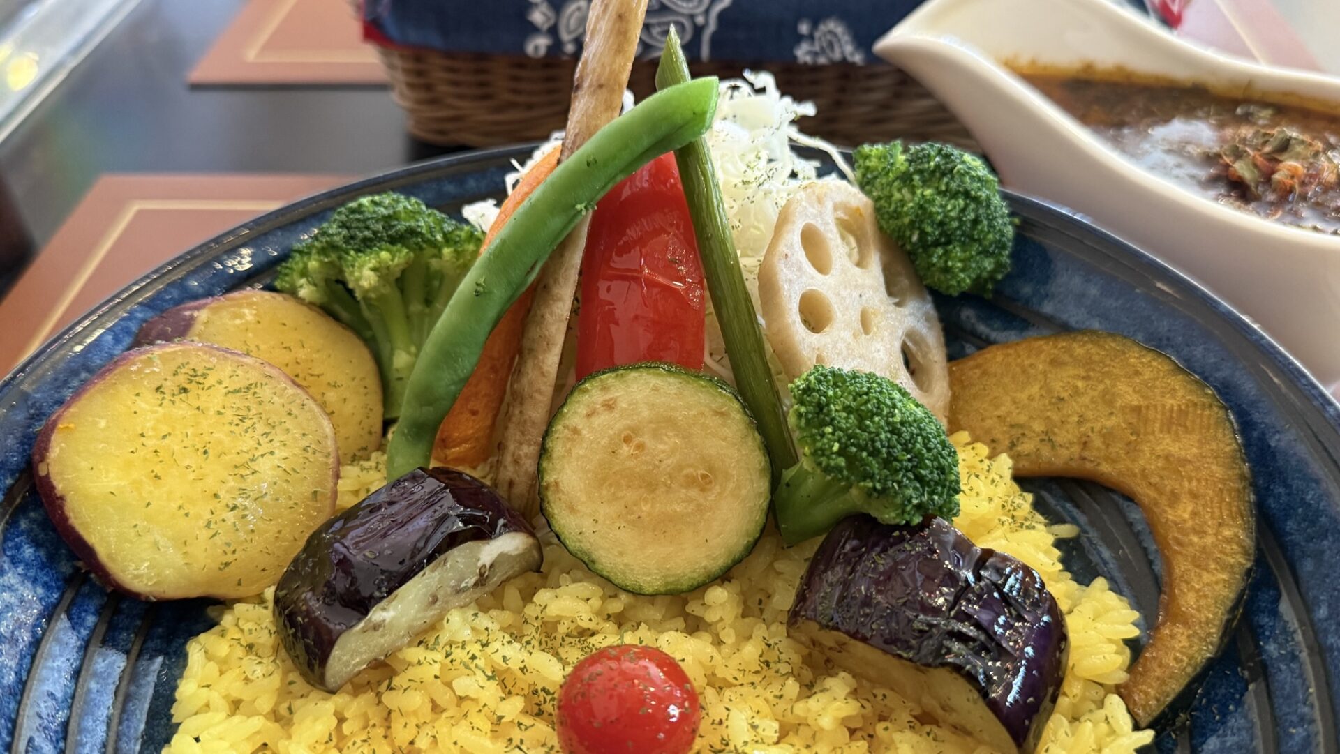 たっぷりのルゥが入ったカレーポット。その底には、たくさんのチキンが入っていて、食感はとても柔らかいです。ターメリックライスの上には、色鮮やかな揚げた野菜が10種類以上のっていて、カレーと野菜を一緒に食べると、カレーに野菜の甘みが加わって、味の変化を楽しむことができます。