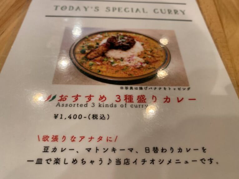 おなかも空いてたし、見た目も楽しみだったので、メニューの中でもおすすめされていた「3種盛りカレー」を選びました!