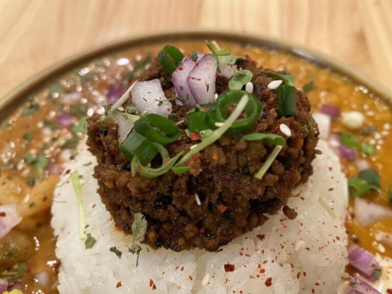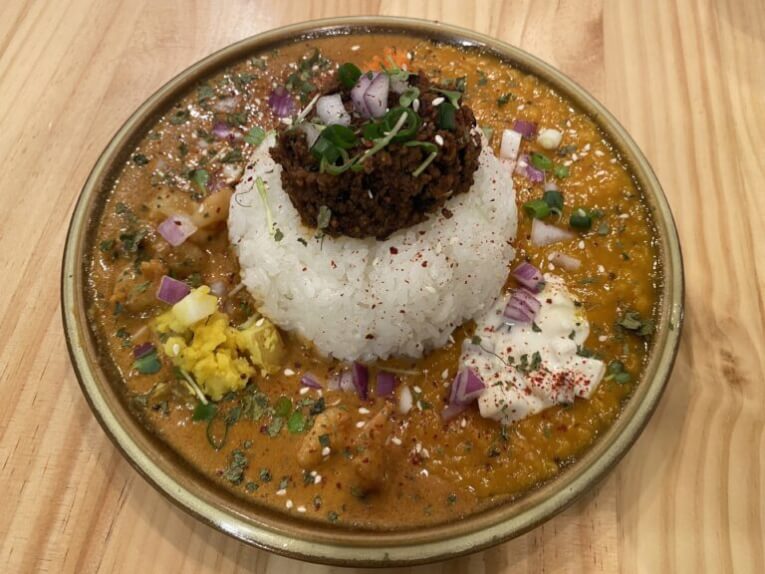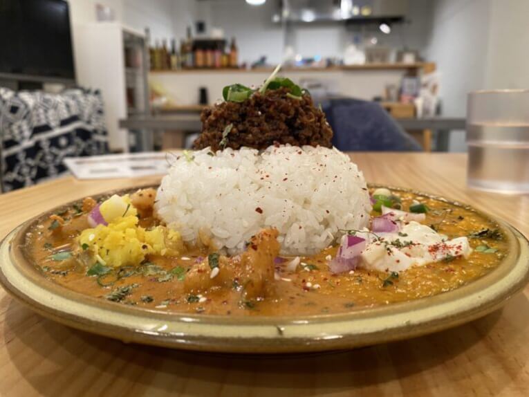 境目が分かりづらいですが、右側が「お豆とお芋」左側がエビとココナッツ、真ん中に鎮座されますのが「ハーブ香るマトンキーマ」です。