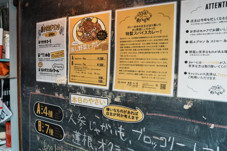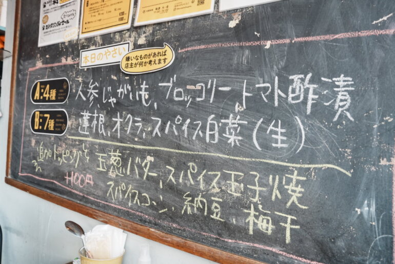 カレーは「蒸し野菜とカレー」のみ。スパイスチキンカレーと山椒キーマのあいがけがデフォルトで、野菜を4種か7種で選べる。選べる野菜は日によって変わるようで、店内の黒板に野菜の種類が書いてありました。