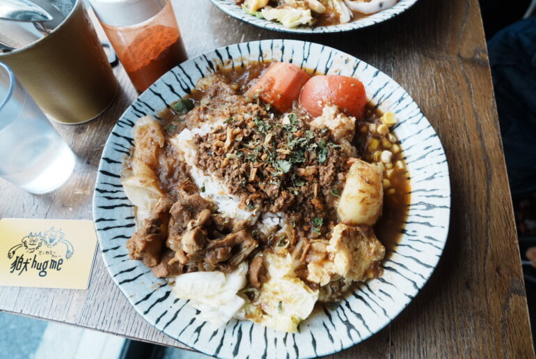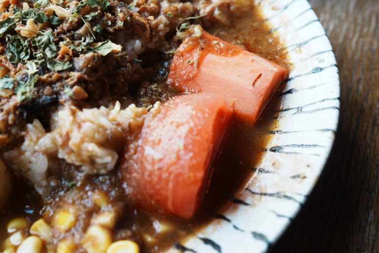 とってもおいしそうなビジュアルです!揚げ玉ねぎと、カスリメティがいい仕事してます!野菜の種類を数えてみると、じゃがいも、れんこん、にんじん、トマト、コーン、玉ねぎ、白菜、オクラ、そしてトッピングメニューのスパイス玉子焼き?あれ、たくさん入ってるぞ・・・もはや店主も何入れたかわかんない!って言ってました。もう気持ちよすぎる!