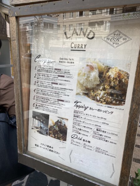 並んでいると、店員さんが螺旋階段を降りてきてメニューを渡しながら注文をとりに来てくれます。これがオープンのスタイルのようです。そして残念なことにこの日の目的だったポークカレーは本日は用意されていないとのこと・・・これにはみなさんがっかりしたことかと思います。僕もそのうちの一人だったわけですが、それならばとめげずに一番高い「骨つき大山どりカレー」を選びました!そして辛さがほしかったのでグリーンチリペーストの1辛をプラス!