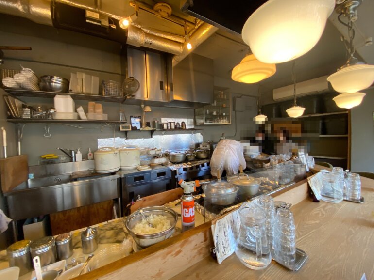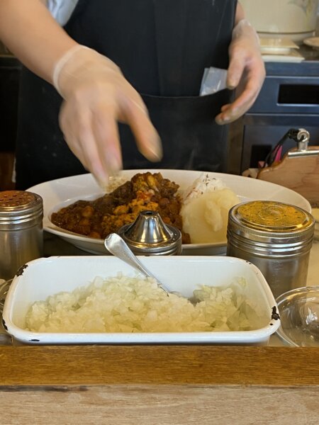 観察していると、店員さんが女性スタッフで3名と、調理をされている店主と思われる男性の4人体制でオペレーションされています。見事な流れ作業で、店主はカレーを調理して、ご飯を盛り付けをしてくれます。そのあとは女性スタッフにパスされて仕上げをしていきます。この仕上げの様子を目の前で見られるのがカウンター席で、これが特等席でした。