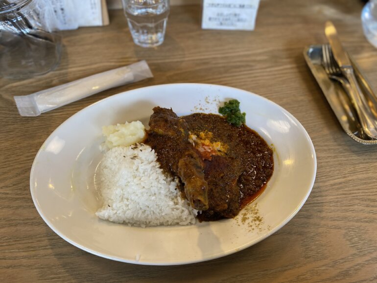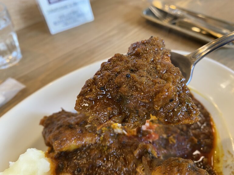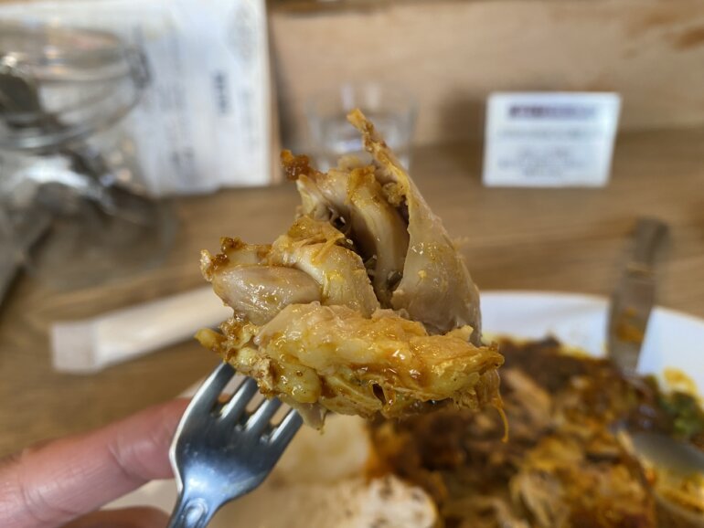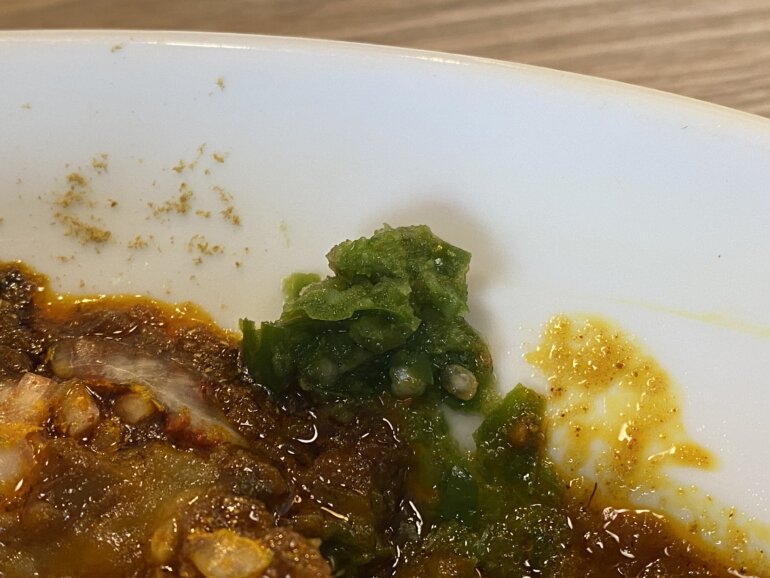 カレーソースの方はソース味が強めに出ていて酸味があるカレーでご飯が進む味でした。ちょっとパキスタンカレーの味付けにも近いような気もしましたが、とはいえこれは唯一無二な位置にあるカレーだと思います。