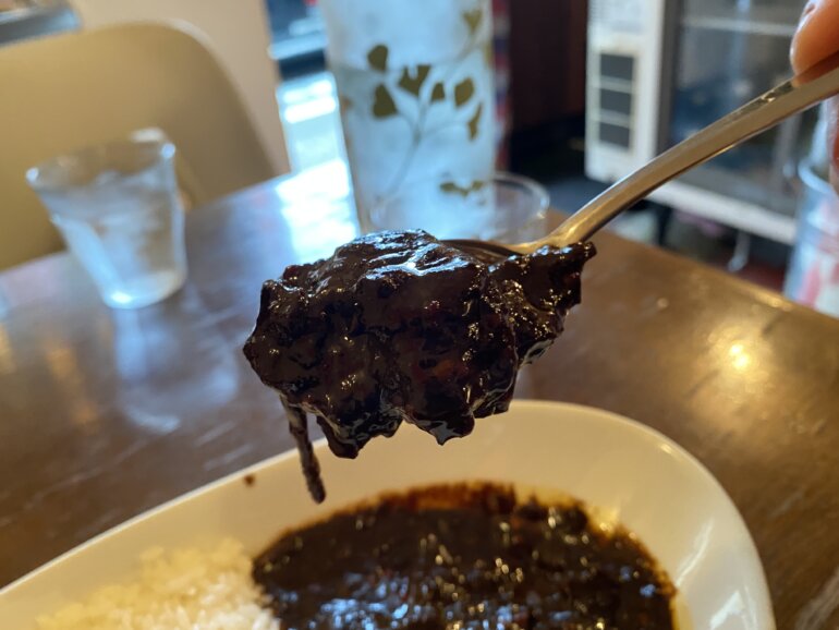 ビーフカレーはトロトロとした質感で、一口食べるとピリッとした刺激を感じます。だけど、慣れちゃっているせいもあると思うのですが、つらいほどではなく、おいしい。辛くて旨いビーフカレーです。