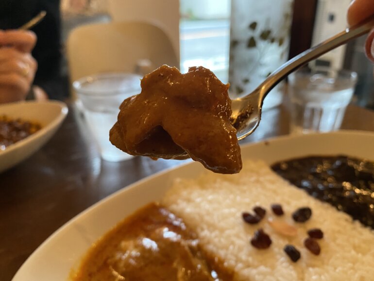 スプーンを進めます。こちらはビーフとは正反対でとってもまろやかで食べやすいカレーとなっていました。