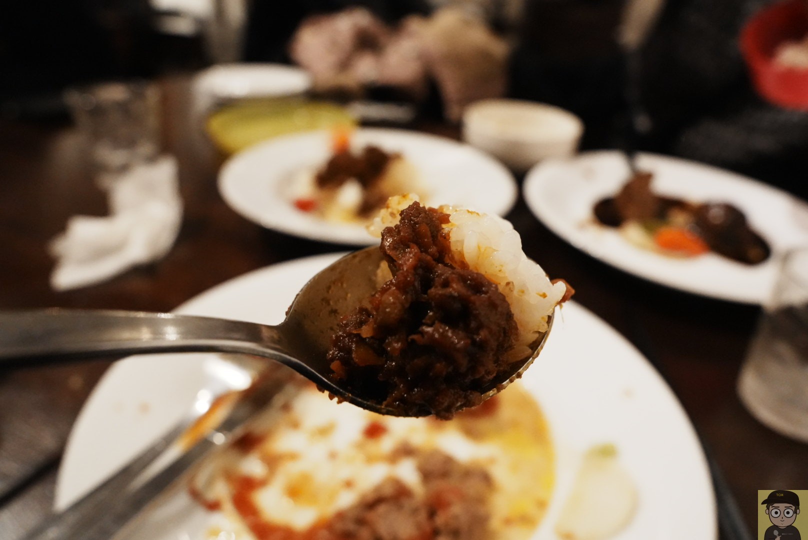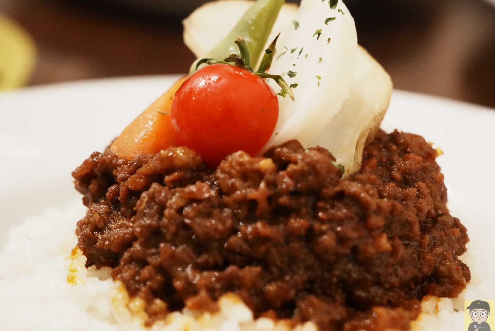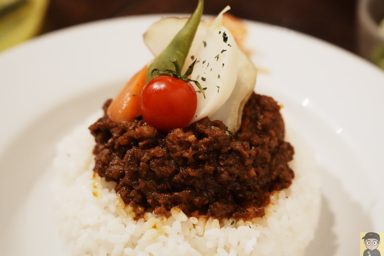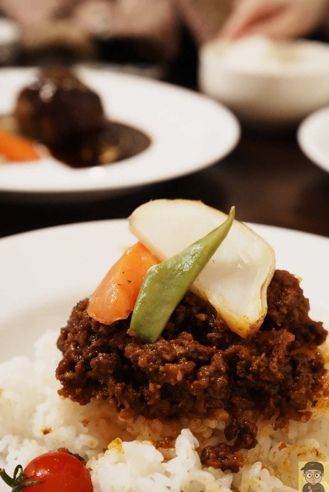 大きなお皿にこんもりと盛られたご飯、そしてその上にたっぷりと乗ったキーマ!ハンバーグが人気のお店なので、粗挽き肉のキーマは期待大です。