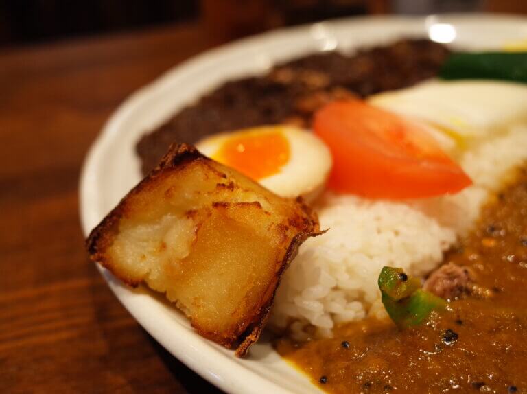 揚げられたジャガイモが最強にうまそうなビジュアルしています。燻製たまごも最高!あとはちょっとびっくりしたけど、生野菜が乗ってました!玉葱スライスと、きゅうりとトマトは生野菜!ちょっとおもしろかった。