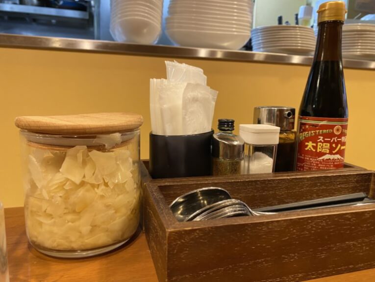 卓上には、スライスされた生姜と、ウスターソースよりの太陽ソースと、どろっと甘めの特濃ソース、そして岩塩が置いてあります。