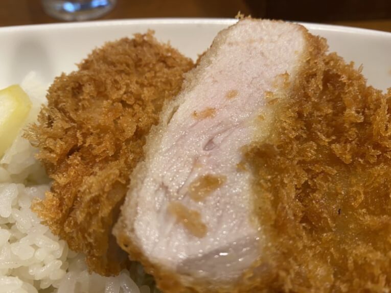 まず一口、なにもつけずに口にいれてみると、ザクっとして端切れの良いお肉っで油がたぎりつつほんのりとピンク部分の赤身肉の旨さを感じた。一瞬カレー屋さんに来ているのかとんかつ屋さんに来ているのか、わからなくなるほどだ。