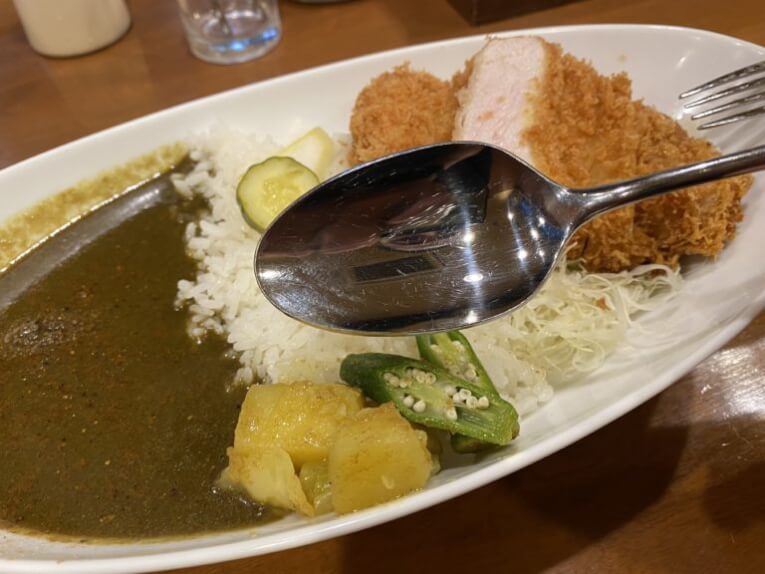 カツだけを堪能したので、いよいよ気になっていたカレーソースです。大きなスプーンをソースにいれると個人的にタイプなシャバシャバ系ソース!お米の防波堤を上手に崩さないと、大事なカツを浸水させてしまいそうなくらいシャバシャバで決壊注意です!