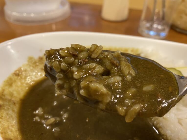 シャバシャバしたソースはスリランカカレーでベースとなるのはスリランカのブラックカリーだ。しっかりと焙煎され香り立つスパイスによる芳ばしい香りが立ち、辛さもエッジが効いている。奥には鰹節のだしや梅の酸味も感じた。スリランカのブラックだけど、とてもライスに合う和風なカレーともいえる。