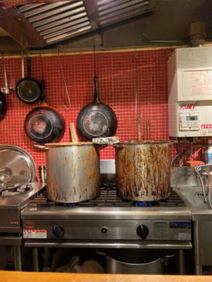 大阪マドラスカレーのソースは30種類のスパイスと、4種類のフルーツを「情熱を詰め込んで」一週間かけて煮込んでいるらしいです。確かに厨房に並ぶ寸胴はまるで年季の入った焼き鳥屋さんのように火をずっとくべられているんだろうなって見た目に仕上がっていました!