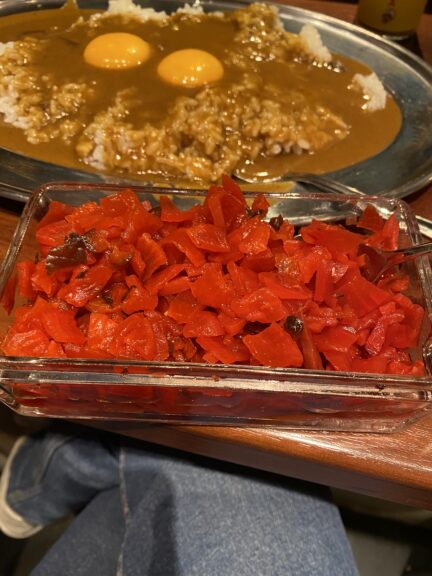 この福神漬を山のようにカレーにつっこむと、さらに甘さが際立ち、そしてシャキシャキとした食感と相まって、さらにおいしくなります。こんなにたくさんの福神漬みたことありますか?ついつい食べ過ぎちゃいます。