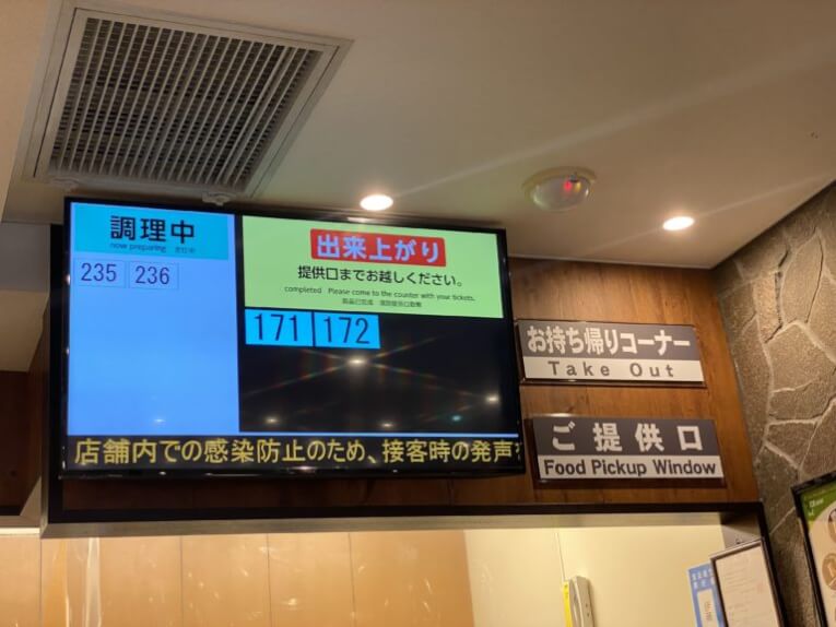 座って待つこと4-5分くらいでしょうか。掲示板に番号が表示されて、カレーが用意されました。