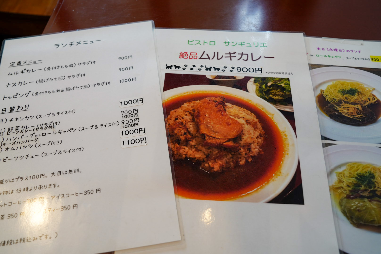 ムルギカレー、茄子カレー、そしてどちらもセットになったトッピングカレーは100円しか変わらないので、断然おすすめ。