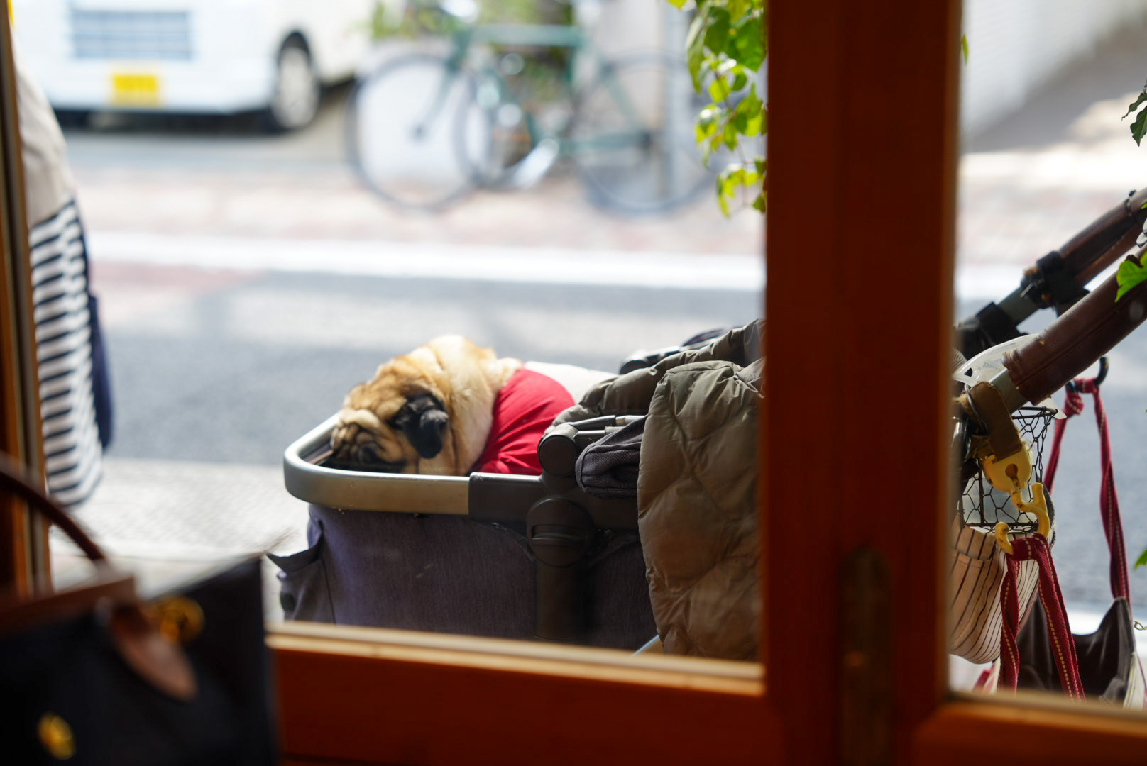 2匹とも終始ずっと寝てて、外で寝てるパグちゃんは近所の人気者で、通りすがりの方々がみんな撫でに来ていました。