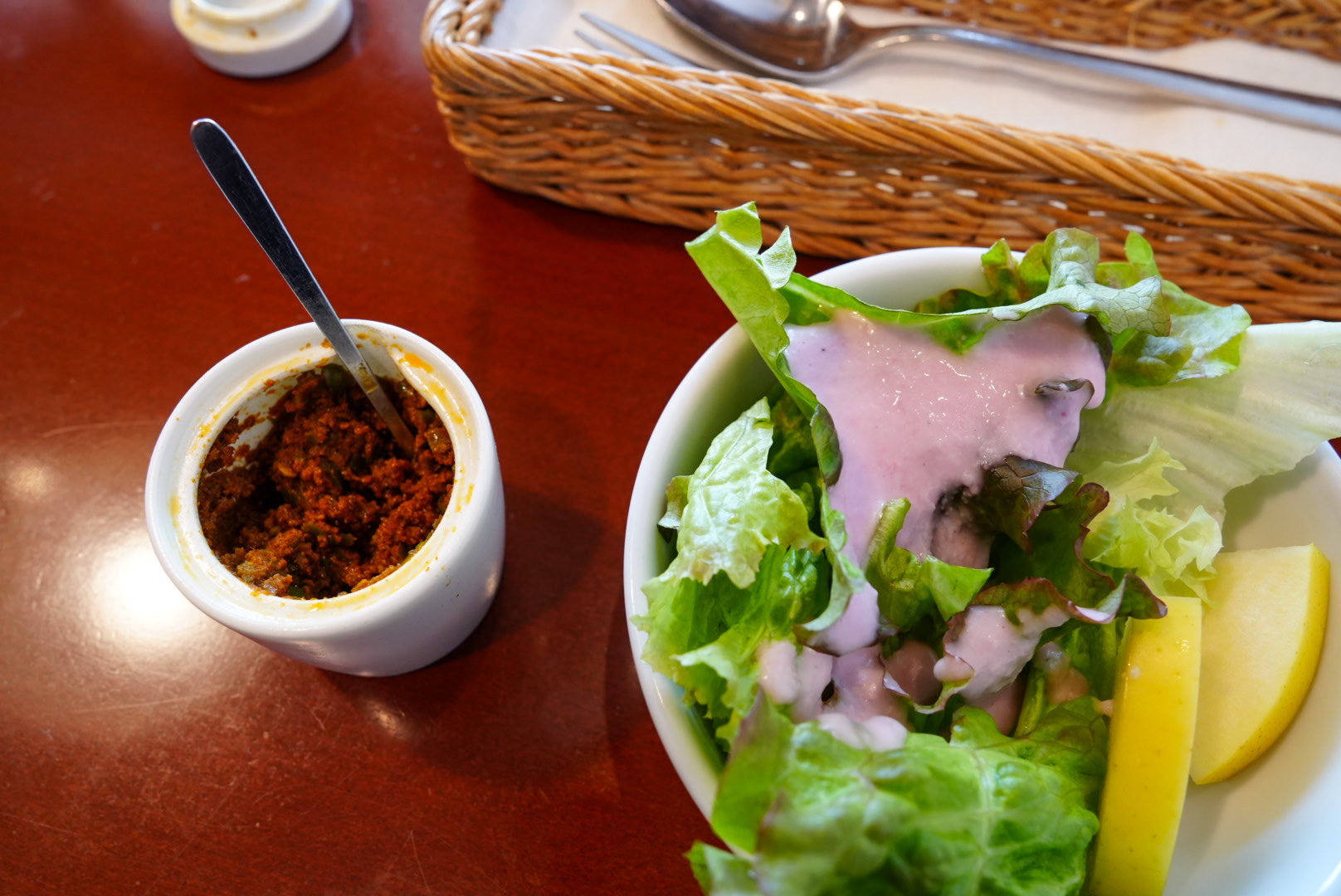 カレーを注文するとすぐに赤玉ねぎのドレッシングが印象的な冷たいサラダが運ばれてきました。リンゴのスライスも添えられていて、とてもおいしい。口の中はカレーを迎え入れる準備万全だ。一緒にきた辛味スパイスも楽しみだ