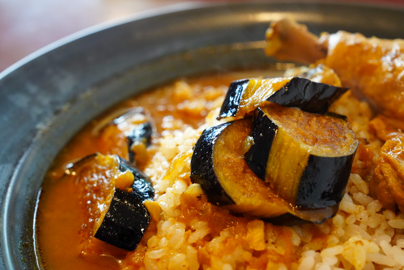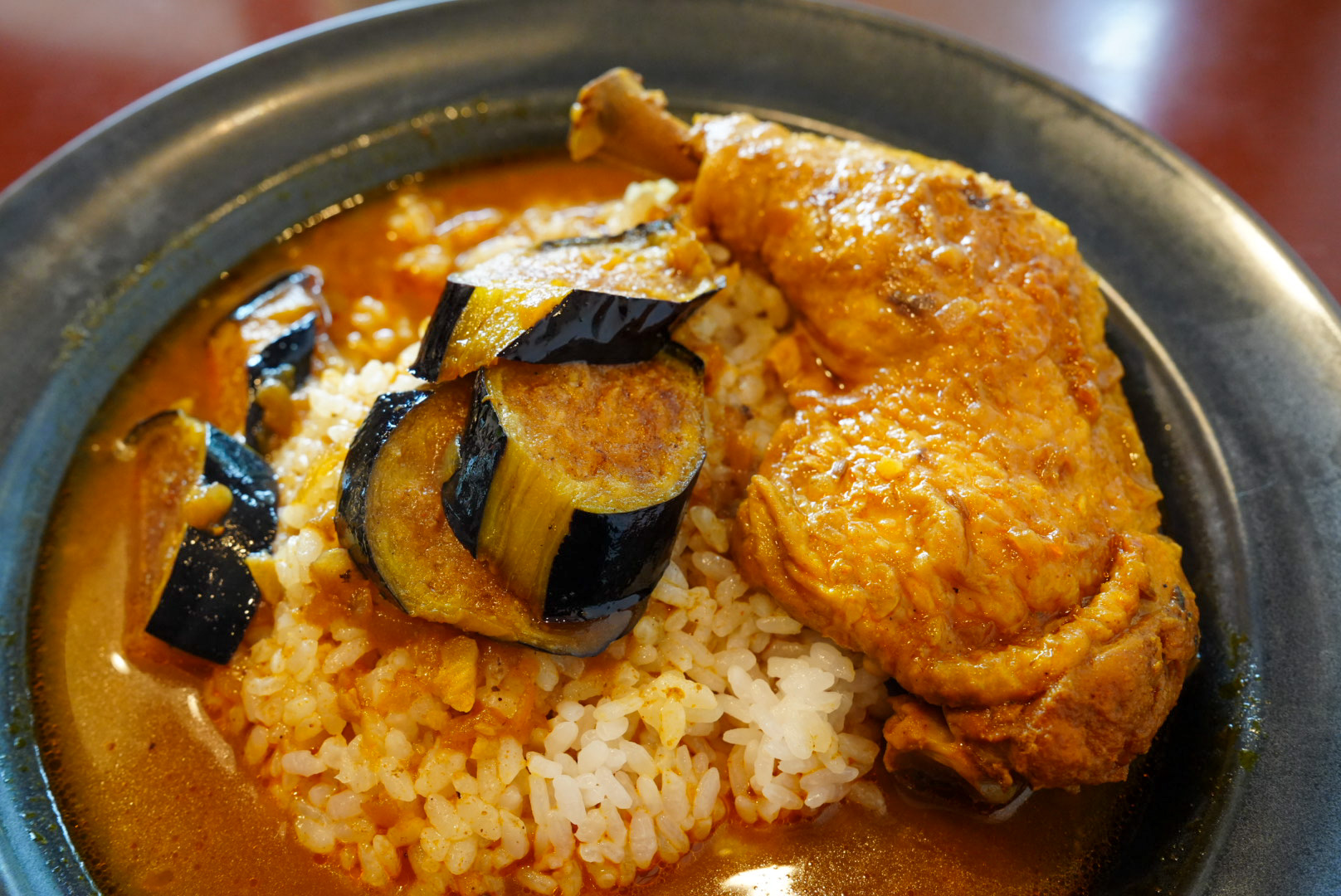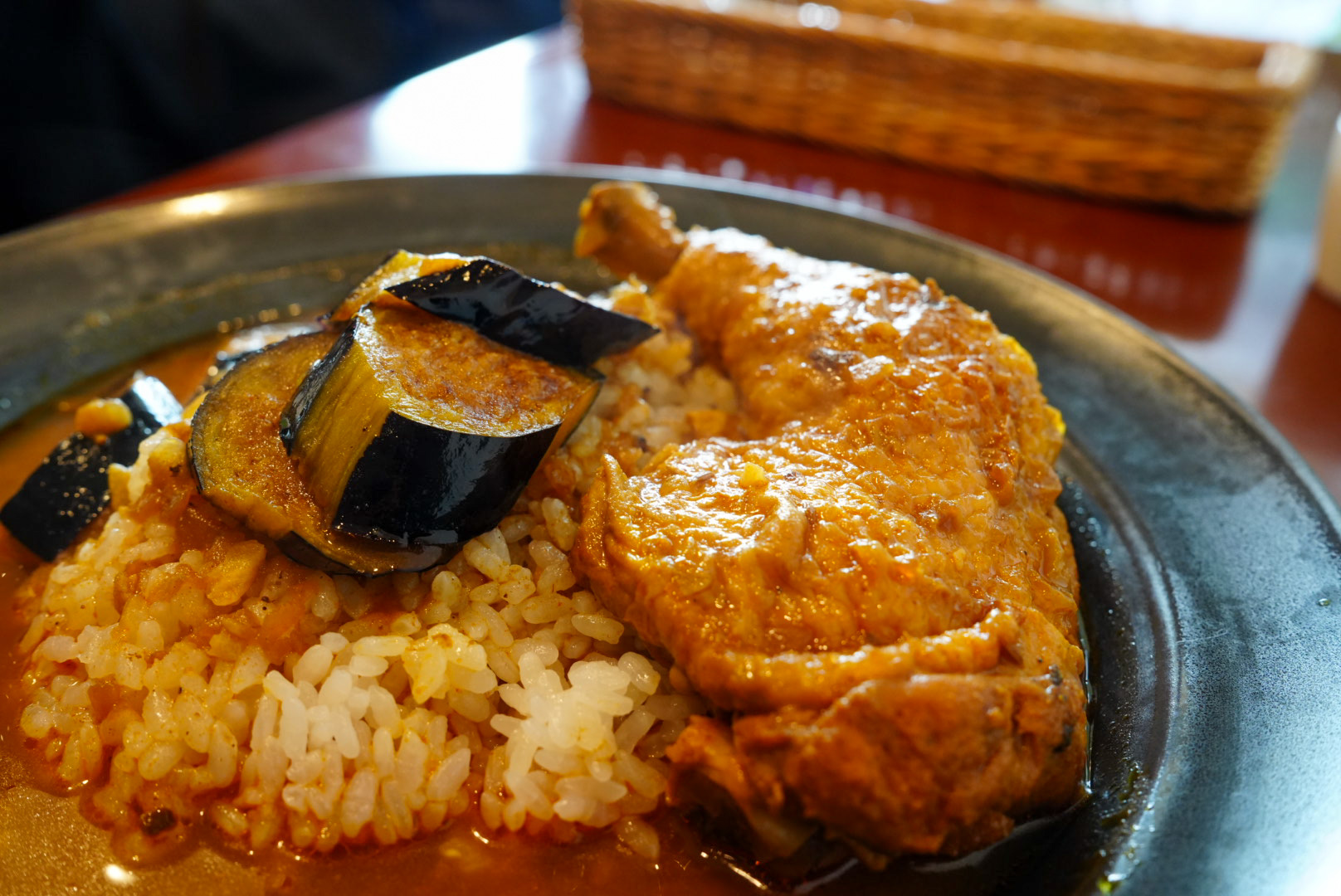 お皿も大きめなのに、3分の1は埋め尽くすほどの大きなチキンレッグが横たわっています。そして、揚げたての茄子がとてもジューシー!スタッフの方からも「茄子は熱いので気をつけてください」と一言ありました。