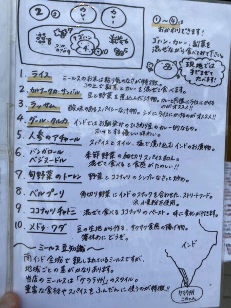 他にも人参のアチャール、バンガロールベジヌードル、旬野菜のトーレン、ベルプール、ココナッツチャトニ、メドゥ・ワダと盛りだくさん!ゼロワンカレーのミールスは南インドの中でも最南端に位置する「ケララ州」のスタイルで、豊富な食材やスパイスをふんだんに使うのが特徴的!