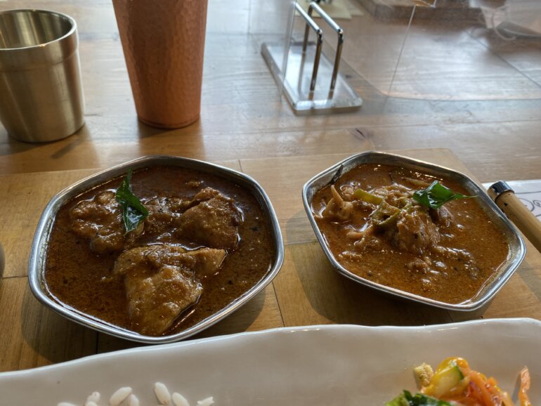 チキンマサラはいつでも食べられる通常メニューらしく、とてもおいしかったです。イカと鱧のカレーはほっくりとしたふわふわな鱧が味わいがおいしくて、そこに絡まるイカの風味マックスなソースがご飯を進ませます。徐々にサンバルや、ラッサムなどと混ぜ合わせながら食べていくと味の変化を楽しむことができるのがミールスの魅力です。