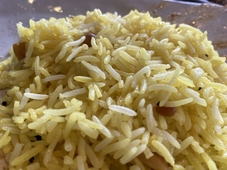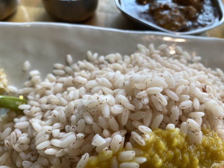 ライス、サンバル、ラッサム、ダールはおかわりできるのが嬉しいですね!そしてライスが3種類選べるんですが、珍しい南インドのレッドマッタライスにしました。豆のようにぷっくらして軽い食感はクセもなく美味しいお米でした!マッタライスの場合は他の2種も選んでおかわりができたのでレモンライスも食べてみましたよー