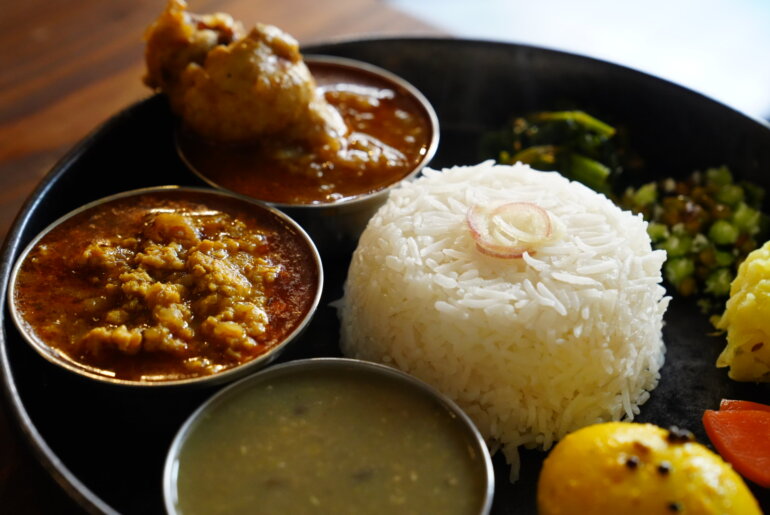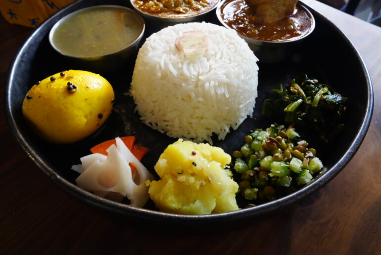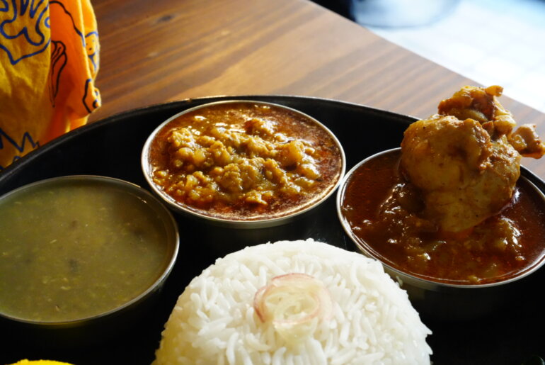 骨付きチキンはスープのような質感にスプーンでも崩れるほどホロホロとしたチキン。そのまますすってみたり、ご飯と副菜と混ぜてみたり楽しめる。山椒キーマは香り重視かと思えば、中華料理で感じるようなピリリっと舌にあたる痺れが印象的。ダルは少し放っておくと表面が乾くほどとろみがかっていて、調理をされている奥様に聞いたところ、片栗粉などは使っておらず豆独自が持っているとろみだそう。今まで食べたダルの中で一番粘度が高く、おいしかった。
