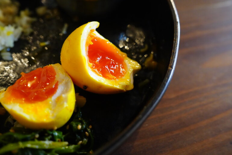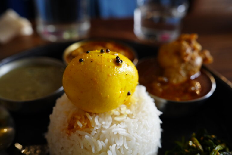 ラス1でギリギリ頼めたアチャールたまごは+100円はランチ価格!ターメリックで黄色がかったたまごの中はオレンジ色で鮮やか黄身。食べてみるとツンと来る酸味が黄身のまろやかさと見事に絡み合ううまさ。これはお酒のつまみにも最適だ。