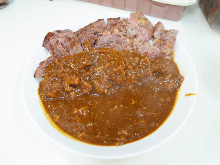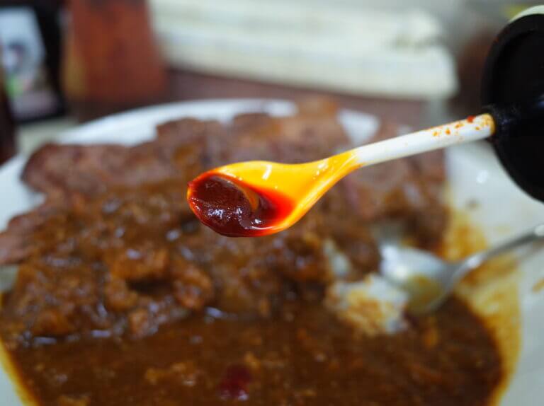 牛すじカレーソースも食べてみましょう!ほどよくとろみのあるソース味強めのソースです。口にいれてすぐは、甘さが感じますが、スパイシーさも感じます。味も濃い目なので、ご飯との相性もバッチリ!これだけでも十分においしいのですが、この味だからこそもっと辛い後味も欲しくなってしまいます。